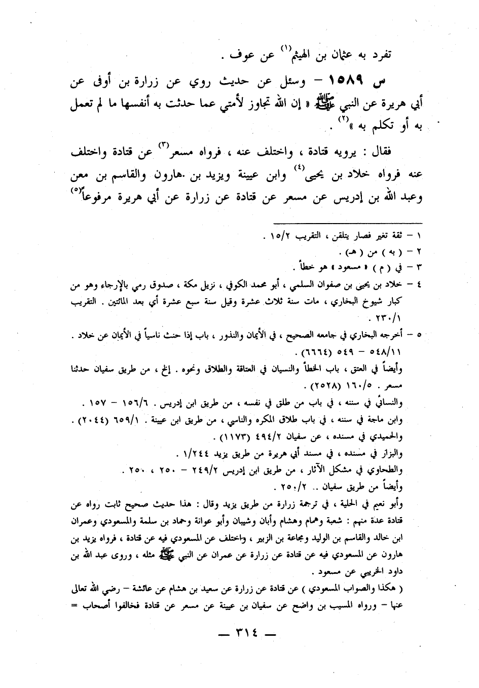 1589- وَسُئِلَ عَنْ حَدِيثٍ رُوِيَ عَنْ زُرَارَةَ بْنِ أوفى، عن أبي هريرة، عن النبي صلى اللَّهُ عَلَيْهِ وَسَلَّمَ: إِنَّ اللَّهَ تَجَاوَزَ لِأُمَّتِي عَمَّا حَدَّثَتْ بِهِ أَنْفُسَهَا مَا لَمْ تَعْمَلْ بِهِ، أَوْ تُكَلَّمْ بِهِ.