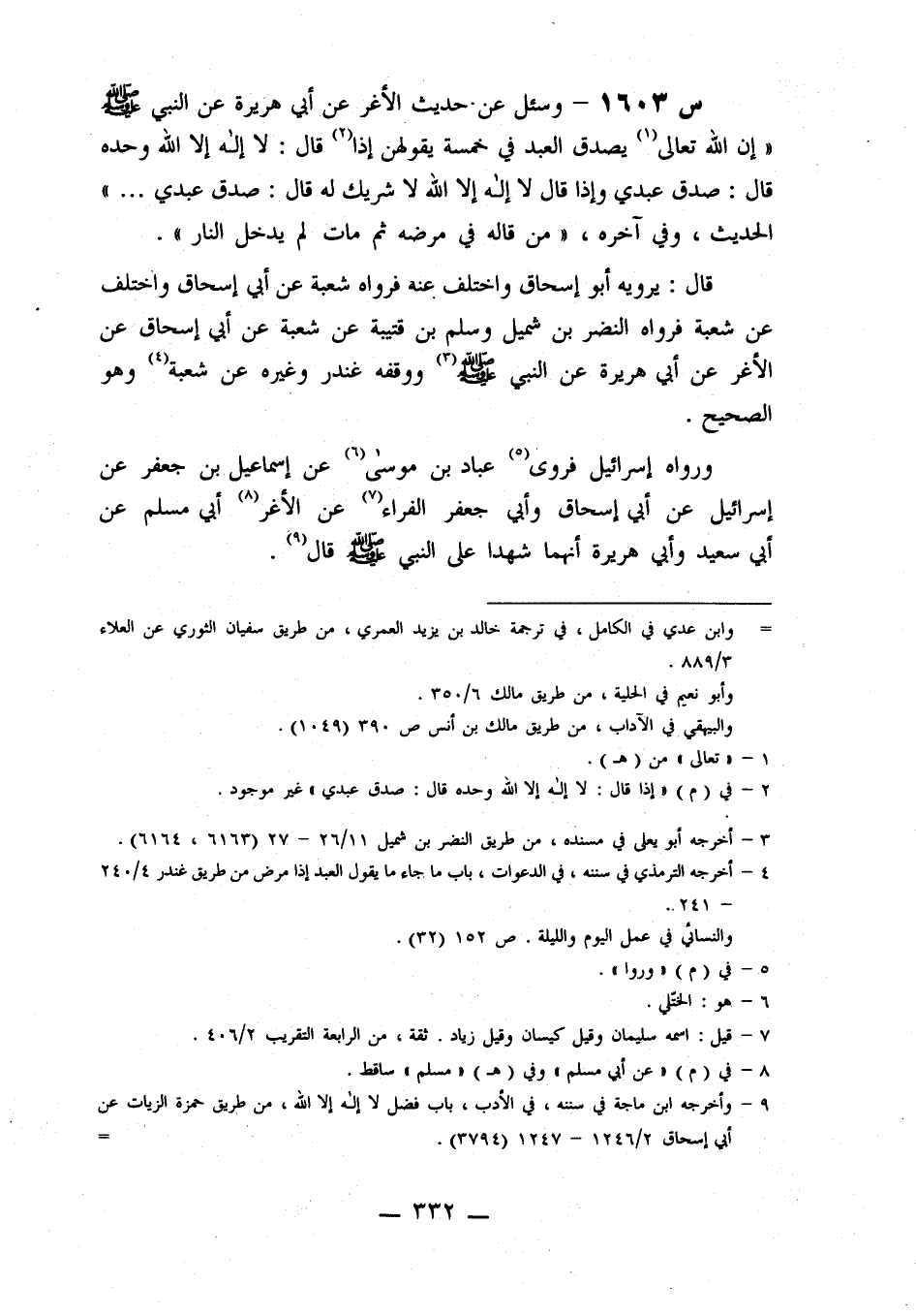 1603- وَسُئِلَ عَنْ حَدِيثِ الْأَغَرِّ، عَنْ أَبِي هُرَيْرَةَ، عَنِ النَّبِيِّ صَلَّى الله عليه وسلم: إن اللَّهَ تَعَالَى يُصَدِّقُ الْعَبْدَ فِي خَمْسَةٍ يَقُولُهُنَّ: إِذَا قَالَ: لَا إِلَهَ إِلَّا اللَّهُ وَحْدَهُ، قَالَ: صَدَقَ عَبْدِي، وَإِذَا قَالَ: لَا إِلَهَ إِلَّا اللَّهُ لَا شَرِيكَ لَهُ، قَالَ: صَدَقَ عَبْدِي ... الْحَدِيثَ.