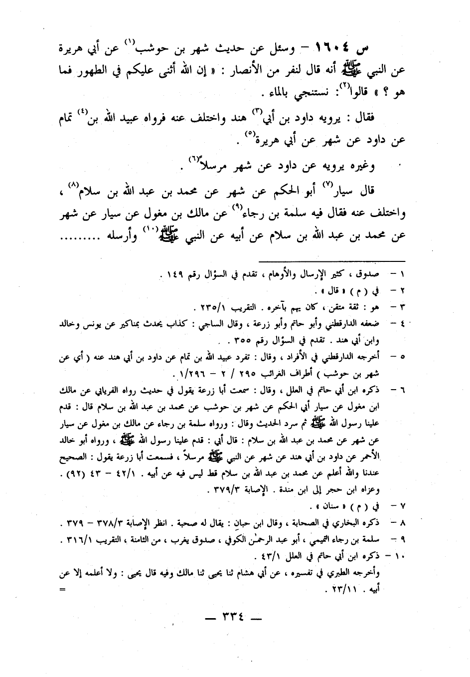 1604- وسئل عن حديث شهر بن حوشب، عن أبي هريرة، عن النبي صلى الله عليه وَسَلَّمَ؛ أَنَّهُ قَالَ لِنَفَرٍ مِنَ الْأَنْصَارِ: إِنَّ اللَّهَ أَثْنَى عَلَيْكُمْ فِي الطُّهُورِ، فَمَا هُوَ؟ قَالُوا: نَسْتَنْجِي بِالْمَاءِ.