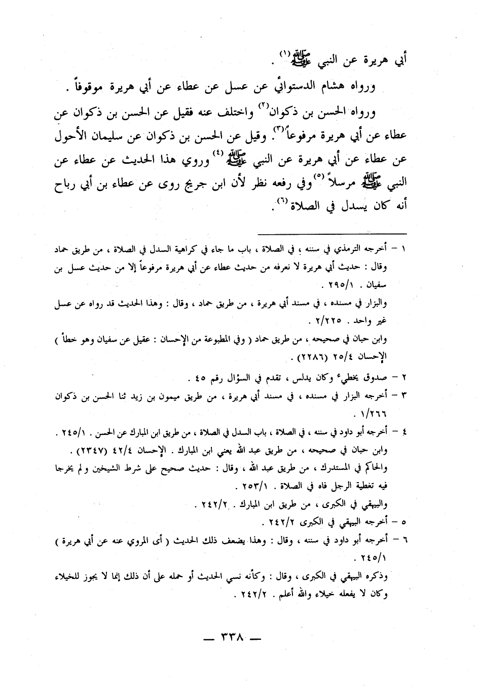 وَقِيلَ: عَنِ الْحَسَنِ بْنِ ذَكْوَانَ، عَنْ سُلَيْمَانَ الْأَحْوَلِ، عَنْ عَطَاءٍ، عَنْ أَبِي هُرَيْرَةَ، عَنِ النبي صلى الله عليه وسلم، وروي هذا الْحَدِيثُ عَنْ عَطَاءٍ، عَنِ النَّبِيِّ صَلَّى اللَّهُ عَلَيْهِ وَسَلَّمَ مُرْسَلًا، وَفِي رَفْعِهِ نَظَرٌ، لِأَنَّ ابْنَ جُرَيْجٍ رَوَى عَنْ عَطَاءِ بْنِ أَبِي رَبَاحٍ، أَنَّهُ كَانَ يَسْدِلُ فِي الصَّلَاةِ.