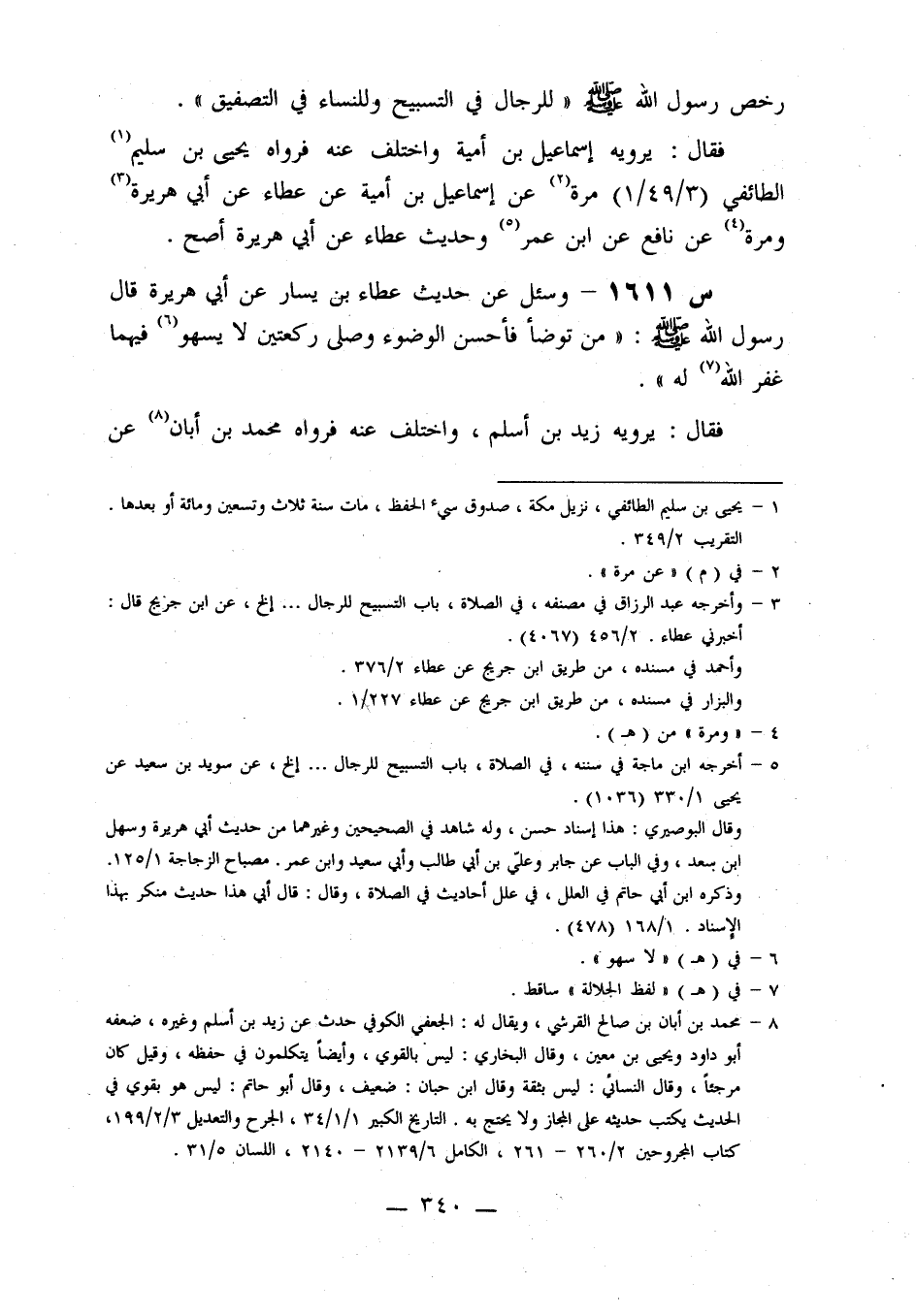 1610- وَسُئِلَ عَنْ حَدِيثِ عَطَاءِ بْنِ أَبِي رَبَاحٍ، عَنْ أَبِي هُرَيْرَةَ؛ رَخَّصَ رَسُولُ اللَّهِ صَلَّى اللَّهُ عَلَيْهِ وَسَلَّمَ لِلرِّجَالِ فِي التَّسْبِيحِ، وَلِلنِّسَاءِ فِي التَّصْفِيقِ.
