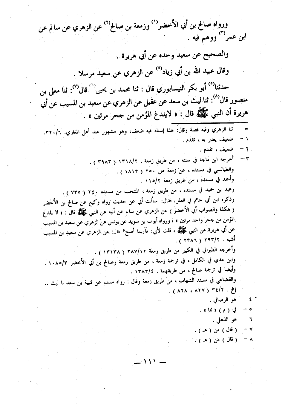 حدثنا أبو بكر النيسابوري، قال: حدثنا محمد بن يحيى، قال: حدثنا معلى بن منصور، قال: حدثنا لَيْثُ بْنُ سَعْدٍ، عَنْ عُقَيْلٍ، عَنِ الزُّهْرِيِّ، عَنْ سعيد بن المسيب، عن أبي هريرة، أن النبي صلى الله عليه وسلم، قال: لَا يُلْدَغُ الْمُؤْمِنُ مِنْ جُحْرٍ مَرَّتَيْنِ.
