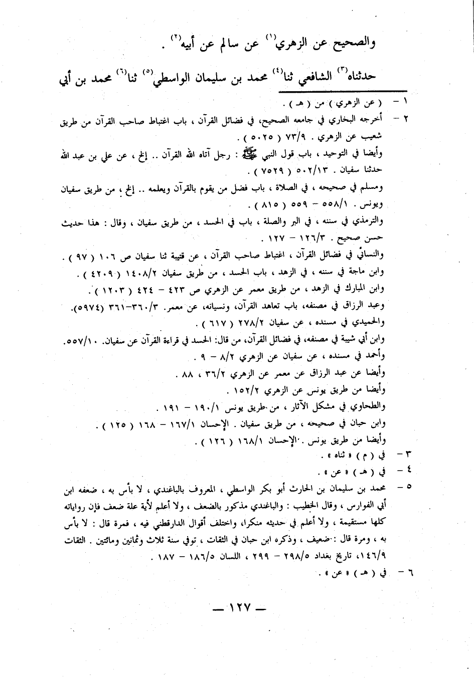 حدثناه الشافعي، حدثنا محمد بن سليمان الواسطي، حدثنا محمد بن أبي نعيم، حدثنا وهيب، حدثنا النُّعْمَانُ بْنُ رَاشِدٍ، عَنِ الزُّهْرِيِّ، عَنْ سَعِيدِ بْنِ الْمُسَيِّبِ، عَنْ أَبِي هُرَيْرَةَ، قَالَ النَّبِيُّ صَلَّى اللَّهُ عَلَيْهِ وَسَلَّمَ: لَا حَسَدَ إِلَّا فِي اثْنَتَيْنِ: رَجُلٌ آتَاهُ اللَّهُ مَالًا فَهُوَ يُنْفِقُهُ سِرًّا وَجَهْرًا، وَرَجُلٌ أُوتِيَ الْقُرْآنَ فَهُوَ يَتْلُوهُ آنَاءَ اللَّيْلِ وَآنَاءَ النَّهَارِ.
