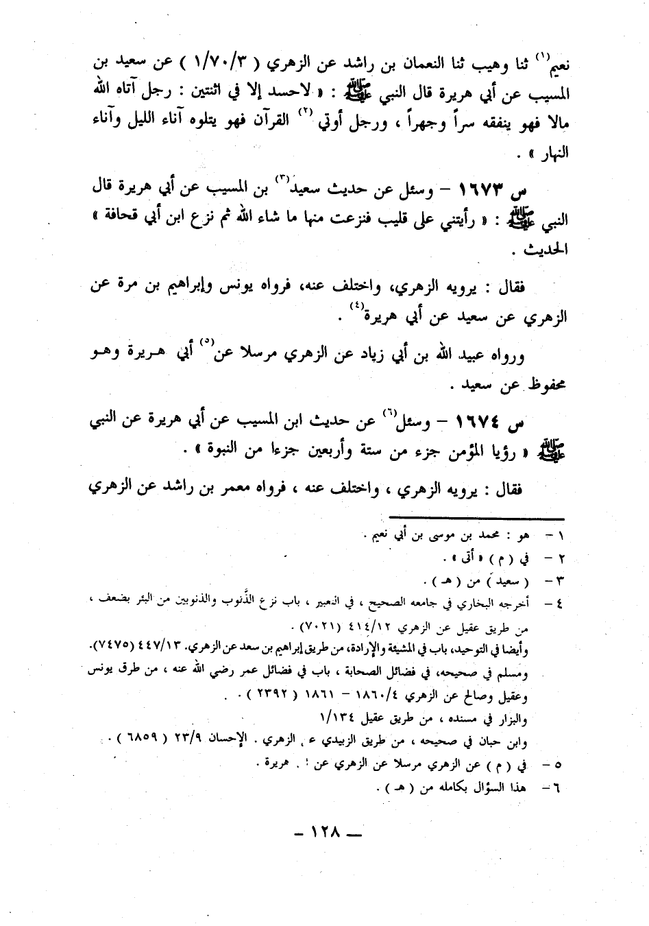 1674- وَسُئِلَ عَنْ حَدِيثِ ابْنِ الْمُسَيِّبِ، عَنْ أبي هريرة، عن النبي صلى الله عليه وَسَلَّمَ: رُؤْيَا الْمُؤْمِنِ جُزْءٌ مِنْ سِتَّةٍ وَأَرْبَعِينَ جُزْءًا مِنَ النُّبُوَّةِ.