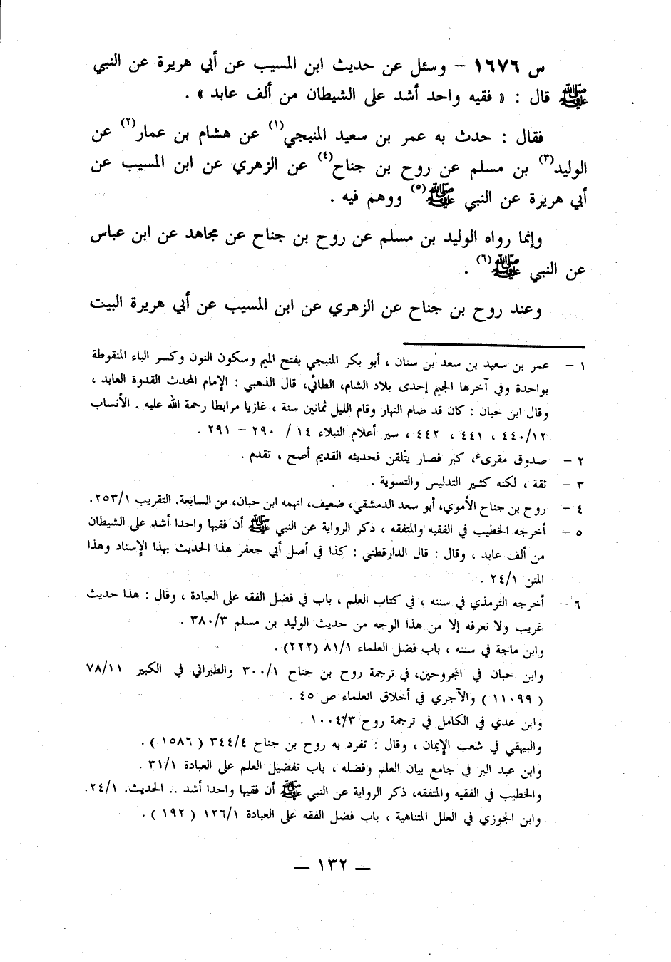 1676- وسئل عن حديث ابن المسيب، عن أبي هريرة، عن النبي صلى الله عليه وسلم، قَالَ: فَقِيهٌ وَاحِدٌ أَشَدُّ عَلَى الشَّيْطَانِ مِنْ أَلْفِ عَابِدٍ.