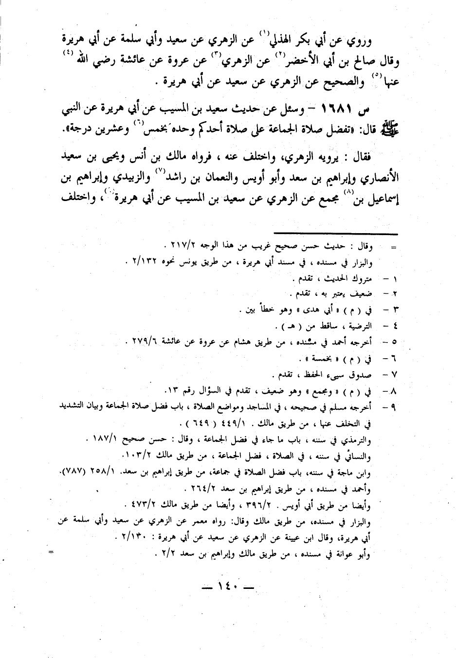 1681- وسئل عن حديث سعيد بن المسيب، عن أبي هريرة، عن النبي صلى الله عليه وَسَلَّمَ، قَالَ: تُفَضَّلُ صَلَاةُ الْجَمَاعَةِ عَلَى صَلَاةِ أحدكم وحده بِخَمْسٍ وَعِشْرِينَ دَرَجَةً.