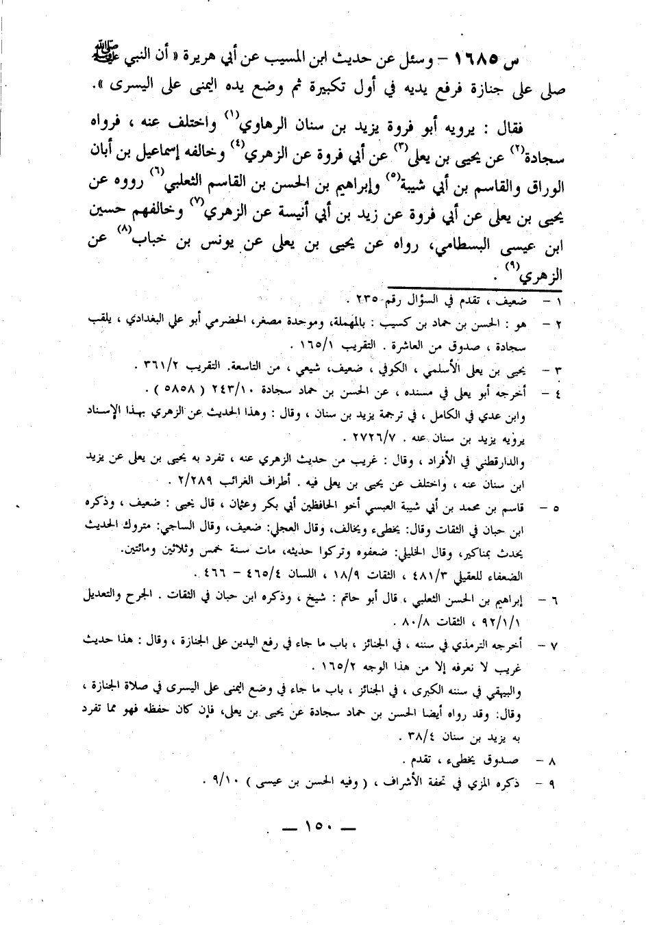 1685- وسئل عن حديث ابن الْمُسَيِّبِ، عَنْ أَبِي هُرَيْرَةَ: أَنَّ النَّبِيَّ صَلَّى الله عليه وسلم صَلَّى عَلَى جِنَازَةٍ فَرَفَعَ يَدَيْهِ فِي أَوَّلِ تَكْبِيرَةٍ، ثُمَّ وَضَعَ يَدَهُ الْيُمْنَى عَلَى الْيُسْرَى.
