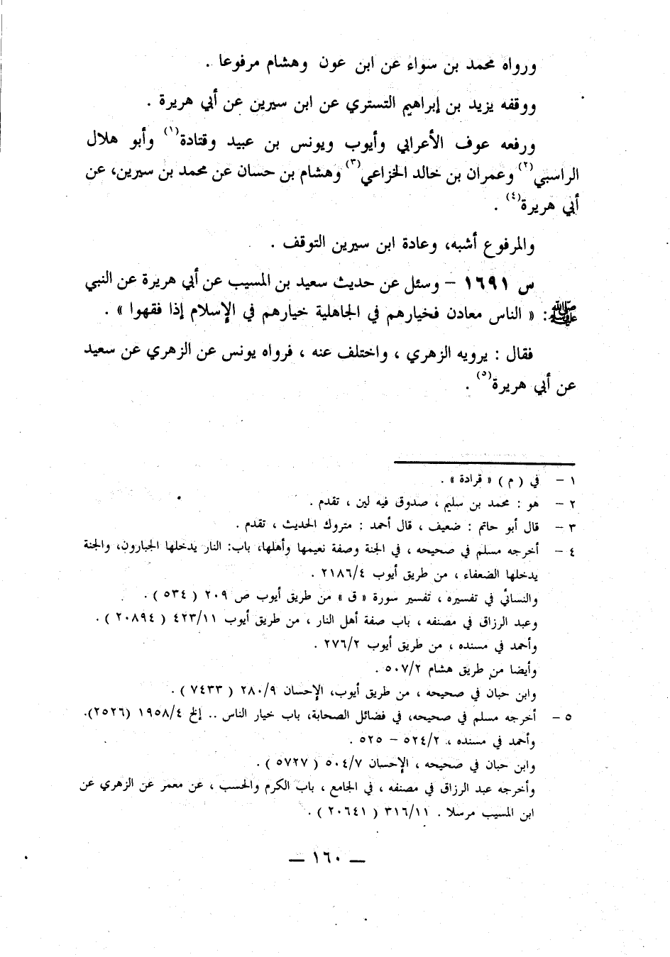 1691- وسئل عن حديث سعيد بن المسيب، عن أبي هريرة، عن النبي صلى الله عليه وَسَلَّمَ: النَّاسُ مَعَادِنٌ فَخِيَارُهُمْ فِي الْجَاهِلِيَّةِ خِيَارُهُمْ فِي الْإِسْلَامِ إِذَا فَقُهُوا.