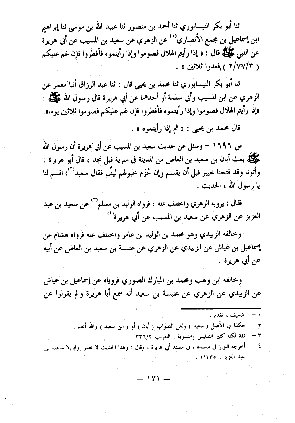 حدثنا أبو بكر النيسابوري، حدثنا محمد بن يحيى، قال: حدثنا عَبْدُ الرَّزَّاقِ، أَنْبَأَنَا مَعْمَرٌ، عَنِ الزُّهْرِيِّ، عَنِ ابْنِ الْمُسَيِّبِ، وَأَبِي سَلَمَةَ، أَوْ أَحَدِهِمَا، عَنْ أَبِي هُرَيْرَةَ، قَالَ رسول الله صلى الله عليه وسلم: إذا رَأَيْتُمُ الْهِلَالَ فَصُومُوا، وَإِذَا رَأَيْتُمُوهُ فَأَفْطِرُوا، فَإِنْ غُمَّ عَلَيْكُمْ فَصُومُوا ثَلَاثِينَ يَوْمًا.