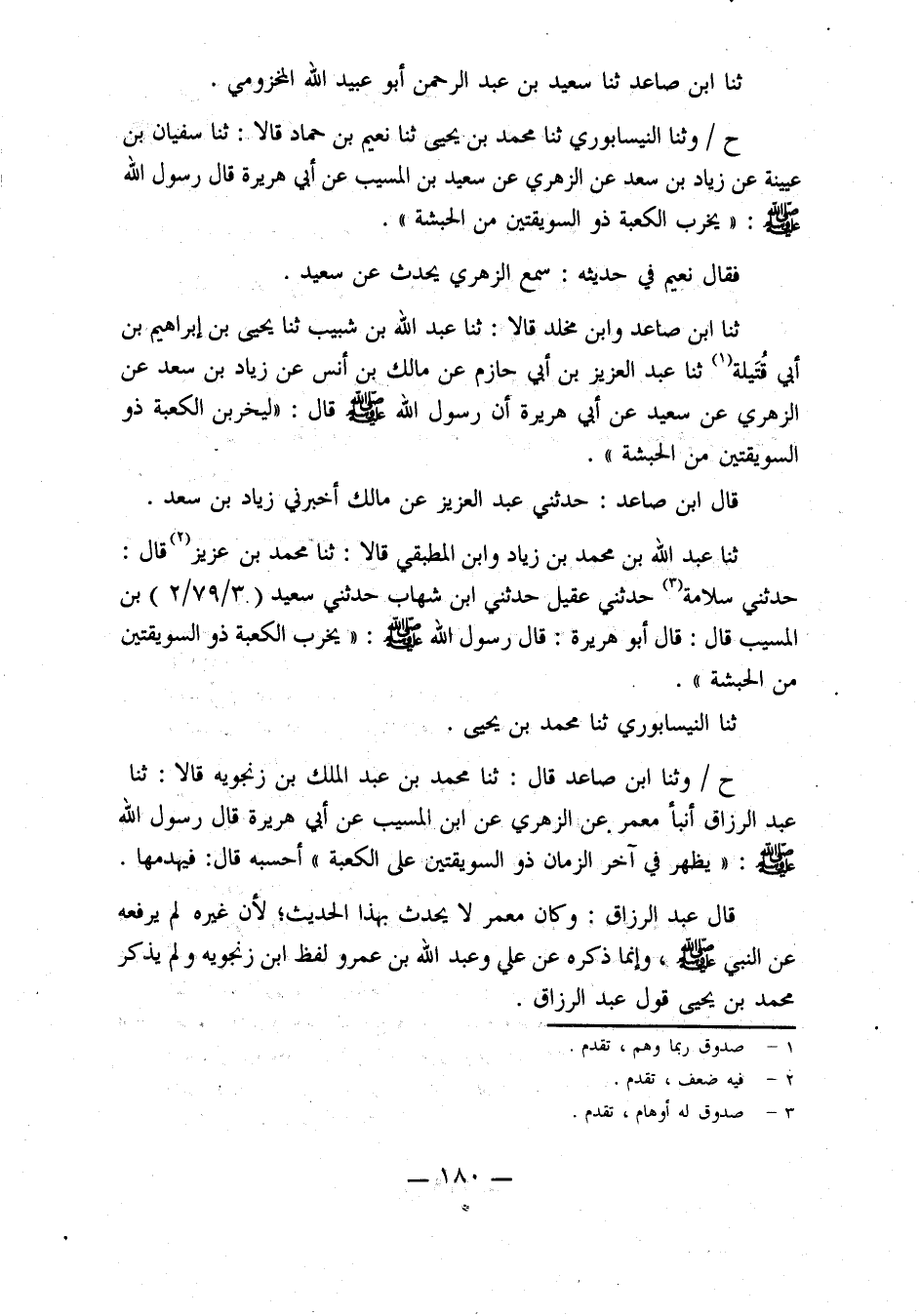 حدثنا النيسابوري، حدثنا محمد بن يحيى (ح) وحدثنا ابن صاعد، قال: حدثنا مُحَمَّدُ بْنُ عَبْدِ الْمَلِكِ بْنِ زَنْجُوَيْهِ، قَالَا: حدثنا عَبْدُ الرَّزَّاقِ، أَنْبَأَنَا مَعْمَرٌ، عَنِ الزُّهْرِيِّ، عَنِ ابن المسيب، عن أبي هريرة، قال رسول الله صلى الله عَلَيْهِ وَسَلَّمَ: يَظْهَرُ فِي آخِرِ الزَّمَانِ ذُو السُّوَيْقَتَيْنِ عَلَى الْكَعْبَةِ أَحْسَبُهُ قَالَ: فَيَهْدِمُهَا.