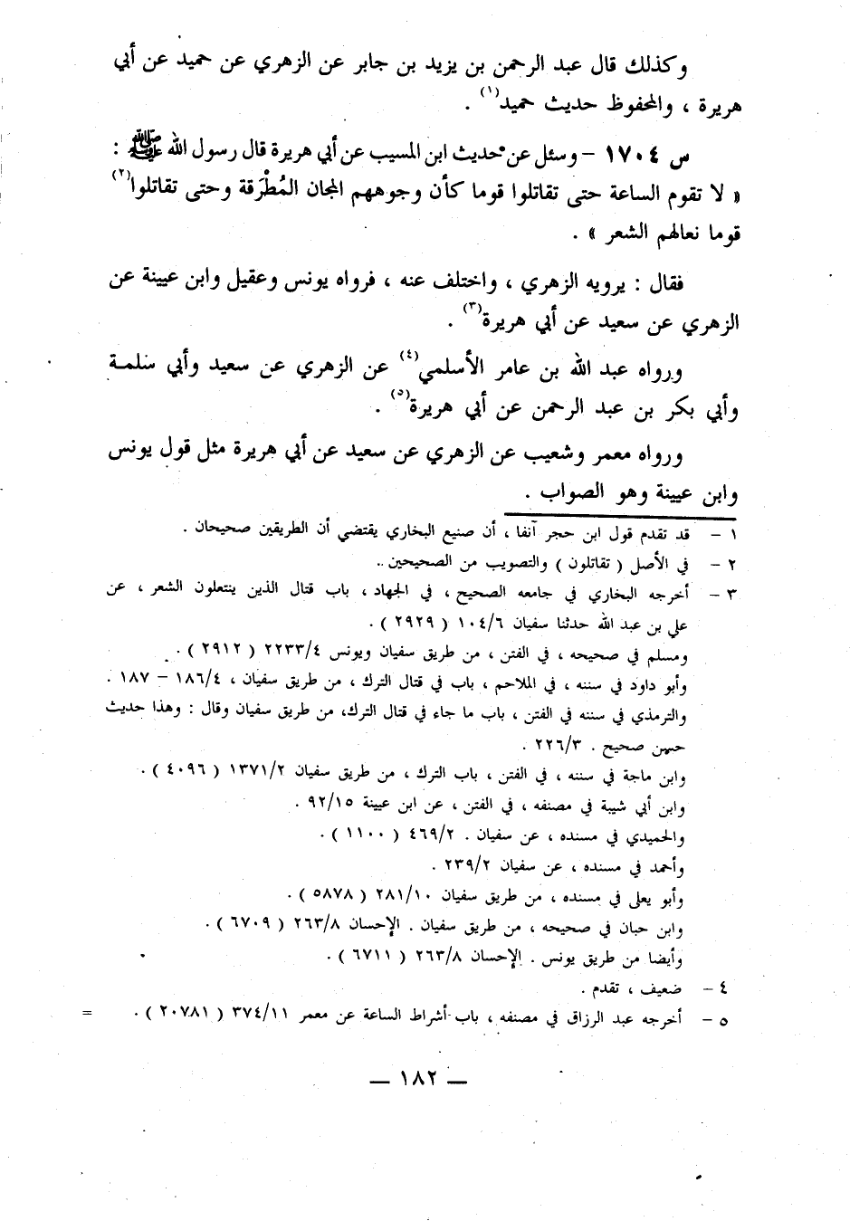 1704- وسئل عن حديث ابن المسيب، عن أبي هريرة، قال رسول الله صَلَّى اللَّهُ عَلَيْهِ وَسَلَّمَ: لَا تَقُومُ السَّاعَةُ حَتَّى تُقَاتِلُوا قَوْمًا كَأَنَّ وُجُوهَهَمُ الْمَجَانُّ الْمُطْرَقَةُ وَحَتَّى تُقَاتِلُوا قَوْمًا نِعَالُهُمُ الشَّعْرُ.