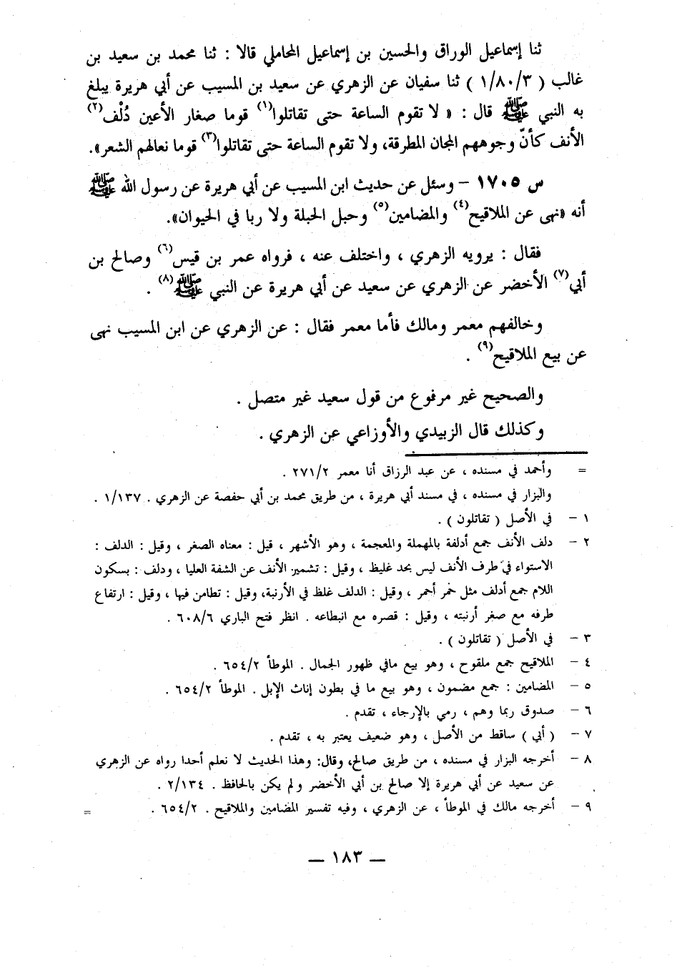 1705- وسئل عن حديث ابن المسيب، عَنْ أَبِي هُرَيْرَةَ، عَنْ رَسُولِ اللَّهِ صَلَّى اللَّهُ عَلَيْهِ وَسَلَّمَ؛ أَنَّهُ نَهَى عَنِ الْمَلَاقِيحِ، وَالْمَضَامِينَ، وَحَبَلِ الْحَبَلَةِ، وَلَا رِبَا فِي الْحَيَوَانِ.