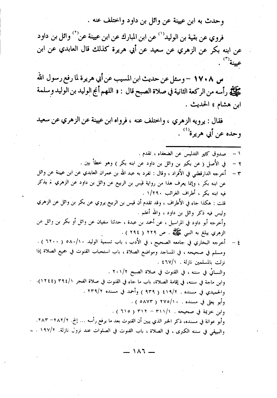 1708- وسئل عن حديث ابن المسيب، عن أبي هُرَيْرَةَ، لَمَّا رَفَعَ رَسُولُ اللَّهِ صَلَّى اللَّهُ عَلَيْهِ وَسَلَّمَ رَأْسَهُ مِنَ الرَّكْعَةِ الثَّانِيَةِ فِي صَلَاةِ الصُّبْحِ، قَالَ: اللَّهُمَّ أَنْجِ الْوَلِيدَ بْنَ الْوَلِيدِ، وَسَلَمَةَ بْنَ هِشَامٍ ... الْحَدِيثَ.