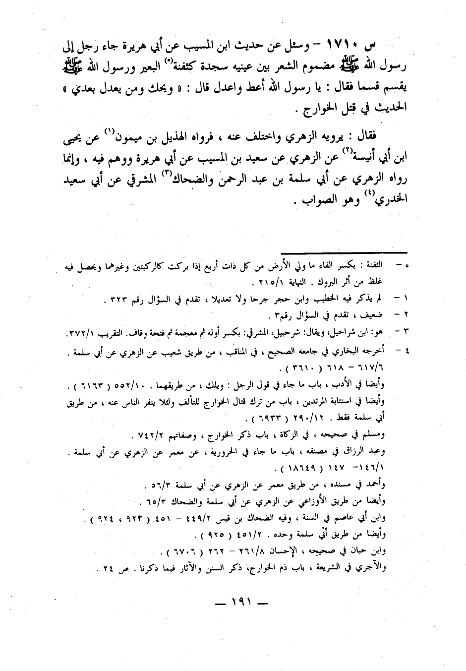 1710- وسئل عن حديث ابن المسيب، عن أبي هُرَيْرَةَ: جَاءَ رَجُلٌ إِلَى رَسُولِ اللَّهِ صَلَّى اللَّهُ عَلَيْهِ وَسَلَّمَ مَضْمُومُ الشَّعْرِ بَيْنَ عَيْنَيْهِ سَجْدَةٌ كَثِفْنَةِ الْبَعِيرِ، وَرَسُولُ اللَّهِ صَلَّى اللَّهُ عَلَيْهِ وَسَلَّمَ يَقْسِمُ قَسْمًا، فَقَالَ: يَا رَسُولَ اللَّهِ أَعْطِ وَاعْدِلْ، قَالَ: وَيْحَكَ وَمَنْ يَعْدِلُ بَعْدِي الْحَدِيثَ فِي قَتْلِ الْخَوَارِجِ.