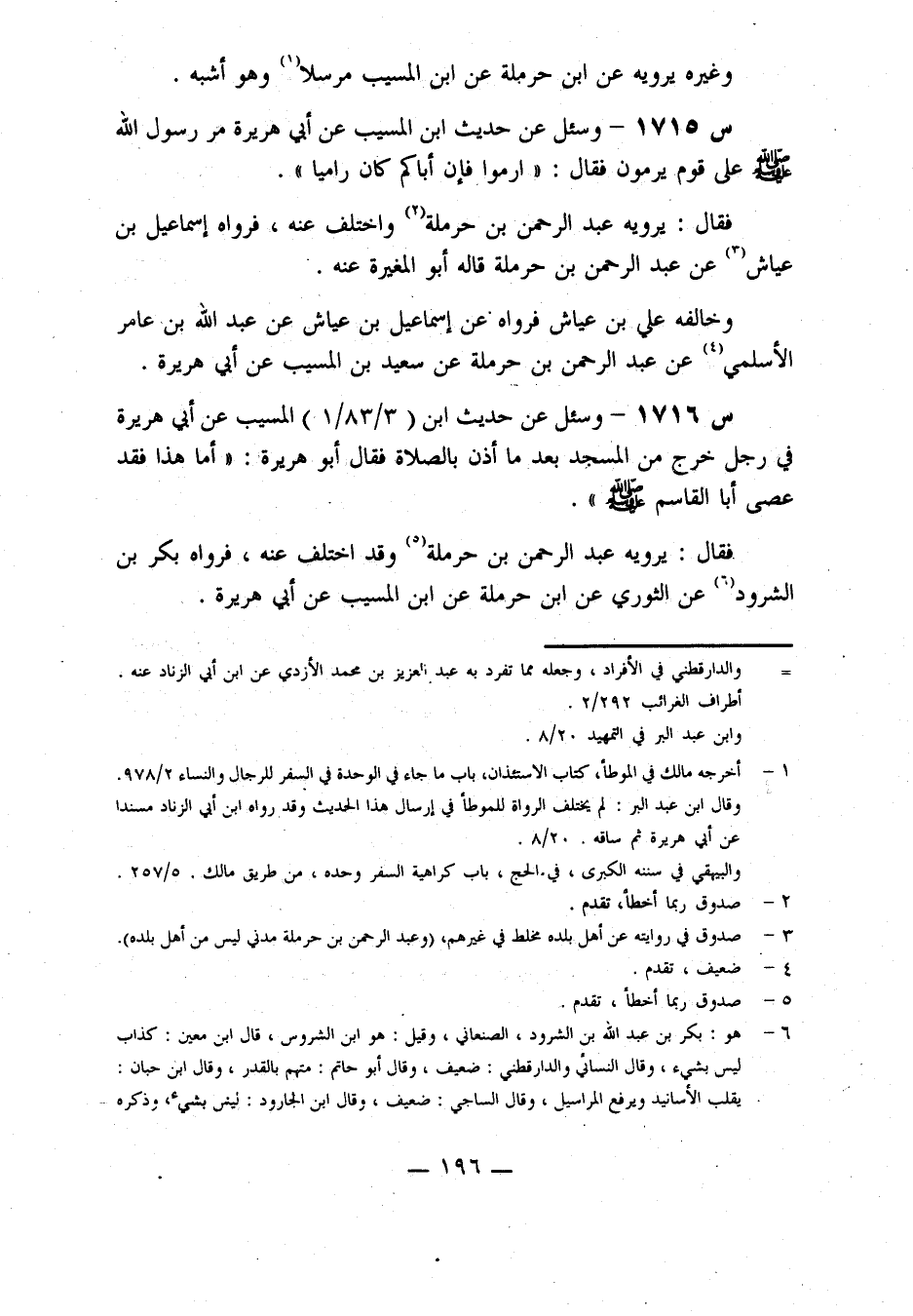 فَقَالَ: يَرْوِيهِ عَبْدُ الرَّحْمَنِ بْنُ حَرْمَلَةَ وَقَدِ اخْتُلِفَ عَنْهُ فَرَوَاهُ بَكْرُ بْنُ الشَّرُودِ، عَنِ الثَّوْرِيِّ، عَنِ ابْنِ حَرْمَلَةَ، عَنِ ابْنِ الْمُسَيِّبِ، عَنْ أَبِي هُرَيْرَةَ.