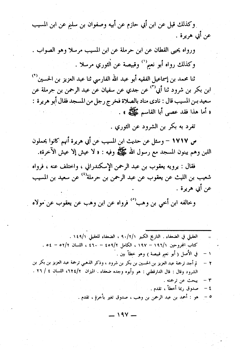 1717- وسئل عن حديث ابن المسيب، عن أبي هُرَيْرَةَ أَنَّهُمْ كَانُوا يَحْمِلُونَ اللَّبِنَ وَهُمْ يَبْنُونَ الَمْسِجَدَ مَعَ رَسُولِ اللَّهِ صَلَّى اللَّهُ عَلَيْهِ وَسَلَّمَ وَفِيهِ لَا عَيْشَ إِلَّا عَيْشُ الْآخِرَةِ.