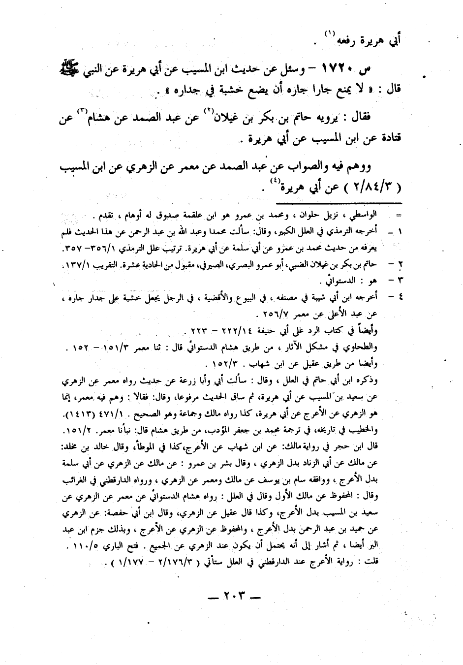 1720- وسئل عن حديث ابن المسيب، عن أبي هريرة، عن النبي صلى الله عليه وسلم، قَالَ: لَا يَمْنَعُ جَارًا جَارَهُ أَنْ يَضَعَ خَشَبَهُ فِي جِدَارِهِ.