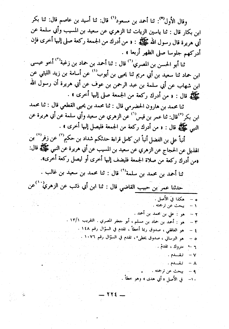 أنبأنا علي بن الفضل، أنبأنا ابْنُ كَامِلٍ قِرَاءَةً، حَدَّثَكُمْ شَدَّادُ بْنُ حَكِيمٍ، عَنْ زُفَرَ بْنِ الْهُذَيْلِ، عَنِ الْحَجَّاجِ، عَنِ الزهري، عن سعيد بن المسيب، عن أبي هريرة، عن النبي صلى الله عليه وسلم، قَالَ: مَنْ أَدْرَكَ رَكْعَةً مِنْ صَلَاةِ الْجُمُعَةِ فَلْيُضِفْ إِلَيْهَا أُخْرَى، أَوْ لُيَصَلِّ رَكْعَةً أُخْرَى.