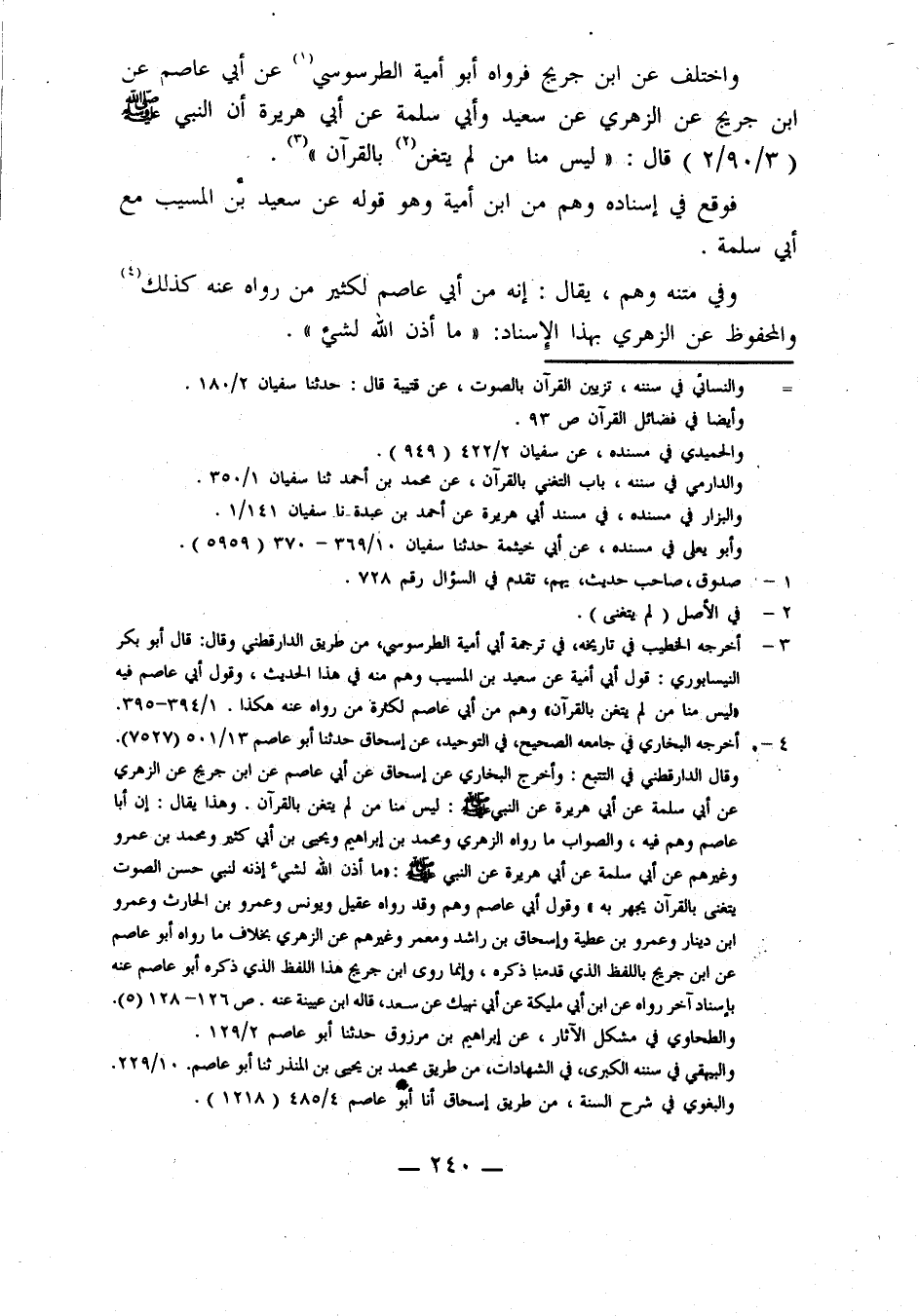 وَاخْتُلِفَ عَنِ ابْنِ جُرَيْجٍ فَرَوَاهُ أَبُو أُمَيَّةَ الطَّرَسُوسِيُّ، عَنْ أَبِي عَاصِمٍ، عَنِ ابْنِ جُرَيْجٍ، عَنِ الزُّهْرِيِّ، عَنْ سَعِيدٍ، وَأَبِي سَلَمَةَ، عَنْ أبي هريرة، أن النبي صَلَّى اللَّهُ عَلَيْهِ وَسَلَّمَ، قَالَ: لَيْسَ مِنَّا مَنْ لَمْ يَتَغَنَّ بِالْقُرْآنِ.