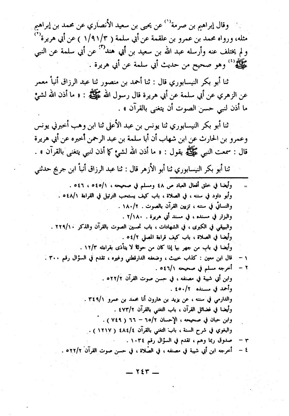 حَدَّثَنَا أَبُو بَكْرٍ النَّيْسَابُورِيُّ، قال: حدثنا أحمد بن منصور، حدثنا عَبْدُ الرَّزَّاقِ، أَنْبَأَنَا مَعْمَرٌ، عَنِ الزُّهْرِيِّ، عَنِ أبي سلمة، عن أبي هريرة، قال رسول الله صَلَّى اللَّهُ عَلَيْهِ وَسَلَّمَ: مَا أَذِنَ اللَّهُ لِشَيْءٍ مَا أَذِنَ لِنَبِيٍّ حَسَنِ الصَّوْتِ أَنْ يَتَغَنَّى بِالْقُرْآنِ.
