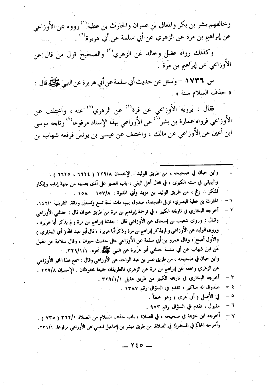 1736- وَسُئِلَ عَنْ حَدِيثِ أَبِي سَلَمَةَ، عَنْ أَبِي هريرة، عن النبي صلى الله عليه وسلم، قَالَ: حَذْفُ السَّلَامِ سُنَّةٌ.