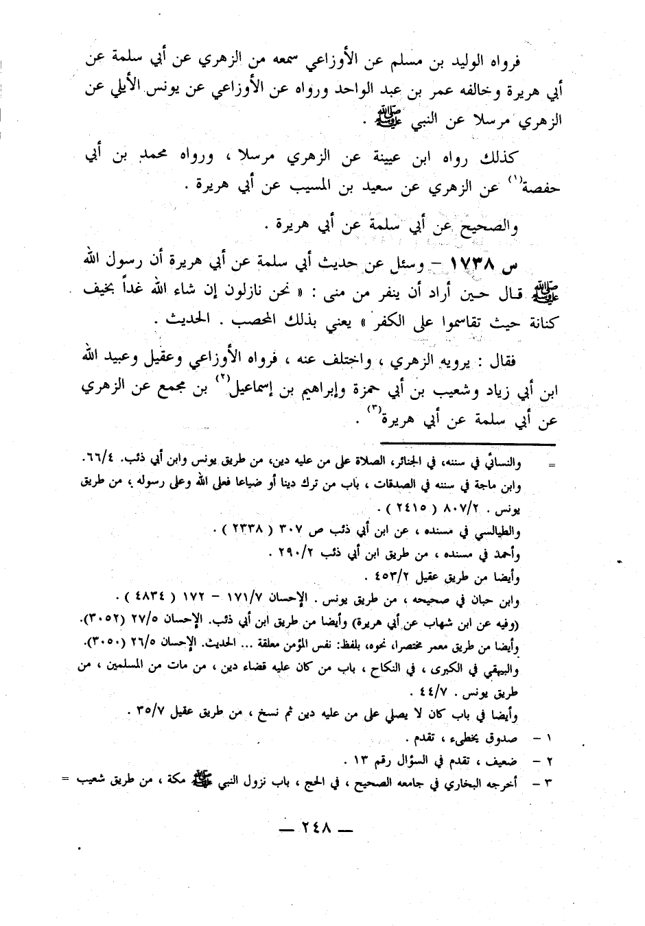 1738- وَسُئِلَ عَنْ حَدِيثِ أَبِي سَلَمَةَ، عَنْ أَبِي هريرة، أن رسول الله صلى الله عليه وَسَلَّمَ، قَالَ حِينَ أَرَادَ أَنْ يَنْفِرَ مِنْ مِنًى: نَحْنُ نَازِلُونَ إِنْ شَاءَ اللَّهُ غَدًا بِخَيْفِ كِنَانَةَ حَيْثُ تَقَاسَمُوا عَلَى الْكُفْرِ، يَعْنِي بِذَلِكَ الْمُحَصَّبِ ... الْحَدِيثَ.