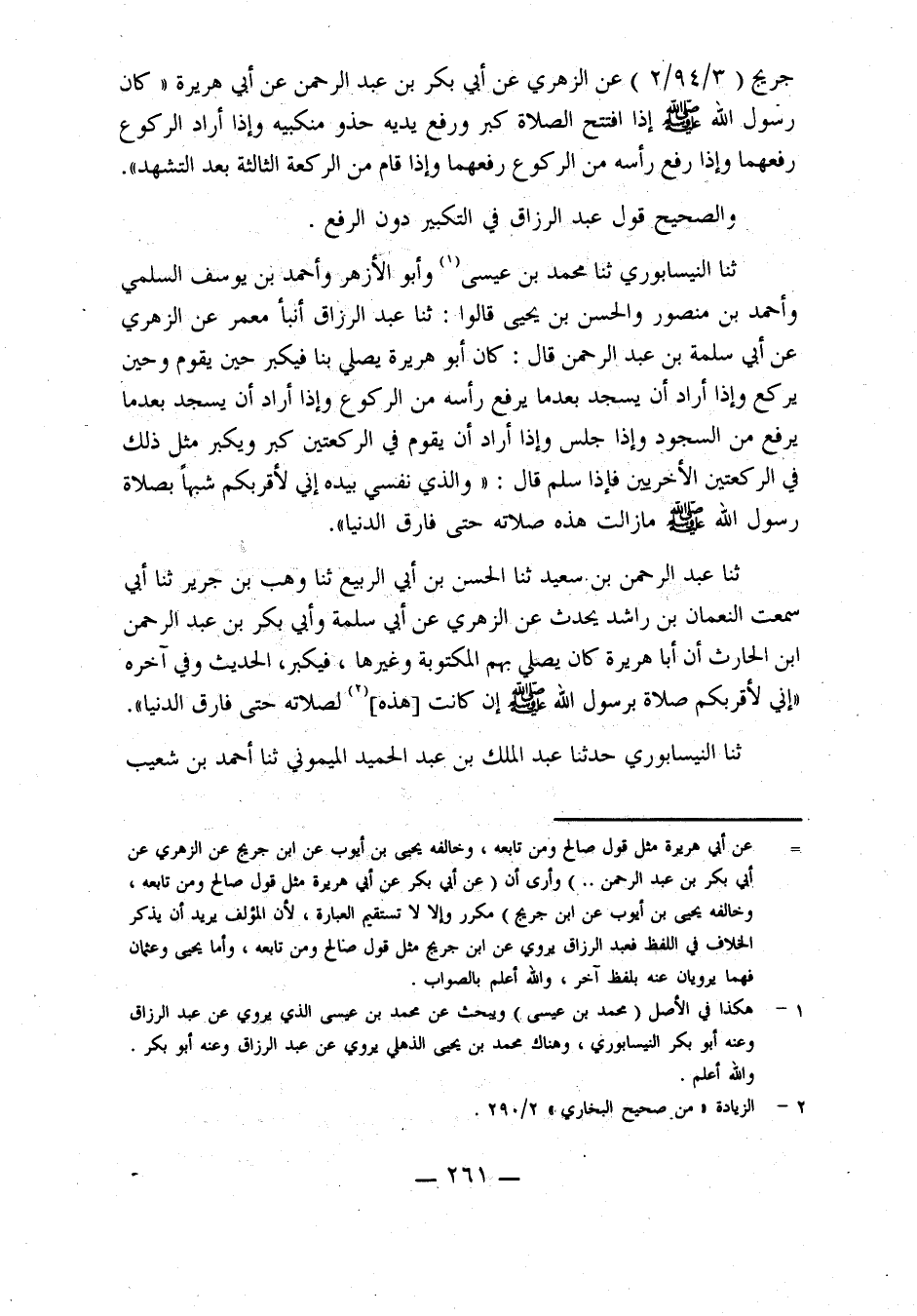 حدثنا النيسابوري، حدثنا مُحَمَّدُ بْنُ عِيسَى، وَأَبُو الْأَزْهَرِ، وَأَحْمَدُ بْنُ يُوسُفَ السُّلَمِيُّ، وَأَحْمَدُ بْنُ مَنْصُورٍ، وَالْحَسَنُ بْنُ يحيى، قالوا: حدثنا عَبْدُ الرَّزَّاقِ، أَنْبَأَنَا مَعْمَرٌ، عَنِ الزُّهْرِيِّ، عَنِ أَبِي سَلَمَةَ بْنِ عَبْدِ الرَّحْمَنِ، قَالَ: كَانَ أَبُو هُرَيْرَةَ يُصَلِّي بنا، فيكبر حِينَ يَقُومُ وَحِينَ يَرْكَعُ، وَإِذَا أَرَادَ أَنْ يَسْجُدَ بَعْدَمَا يَرْفَعُ رَأْسَهُ مِنَ الرُّكُوعِ، وَإِذَا أَرَادَ أَنْ يَسْجُدَ بَعْدَمَا يَرْفَعُ مِنَ السُّجُودِ، وَإِذَا جَلَسَ، وَإِذَا أَرَادَ أَنْ يَقُومَ فِي الركعتين كبر، ويكبر مثل ذلك فِي الرَّكْعَتَيْنِ الْأُخْرَيَيْنِ، فَإِذَا سَلَّمَ، قَالَ: وَالَّذِي نفسي بيده إِنِّي لَأَقْرَبَكُمْ شَبَهًا بِصَلَاةِ رَسُولِ اللَّهِ صَلَّى اللَّهُ عَلَيْهِ وَسَلَّمَ مَا زَالَتْ هَذِهِ صَلَاتَهُ حتى فارق الدنيا.
