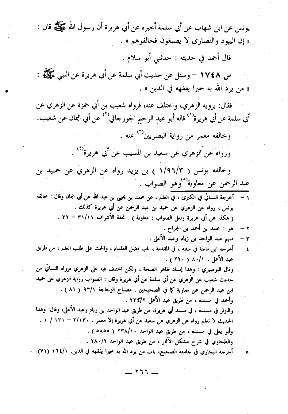 1748- وَسُئِلَ عَنْ حَدِيثِ أَبِي سَلَمَةَ، عَنْ أَبِي هريرة، عن النبي صلى الله عليه وسلم: مَنْ يُرِدِ اللَّهُ بِهِ خَيْرًا يُفَقِّهْهُ فِي الدِّينِ.