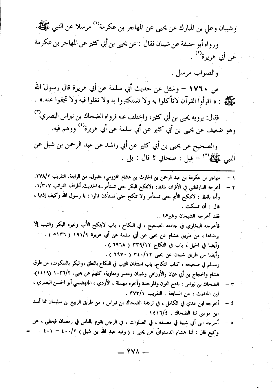 1760- وَسُئِلَ عَنْ حَدِيثِ أَبِي سَلَمَةَ، عَنْ أَبِي هريرة، قال رسول الله صلى الله عليه وسلم: اقرؤوا الْقُرْآنَ لَا تَأْكُلُوا بِهِ وَلَا تَسْتَكْثِرُوا بِهِ وَلَا تَغْلُوا فِيهِ وَلَا تَجْفُوا عَنْهُ.