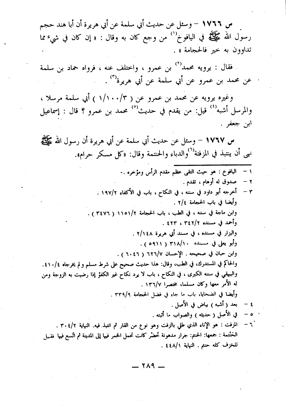1766- وَسُئِلَ عَنْ حَدِيثِ أَبِي سَلَمَةَ، عَنْ أَبِي هُرَيْرَةَ: أَنَّ أَبَا هِنْدٍ حَجَمَ رَسُولَ اللَّهِ صَلَّى اللَّهُ عَلَيْهِ وَسَلَّمَ فِي الْيَافُوخِ مِنْ وَجَعٍ كَانَ بِهِ، وَقَالَ: إِنْ كَانَ فِي شَيْءٍ مِمَّا تَدَاوُونَ بِهِ خَيْرٌ فَالْحِجَامَةُ.