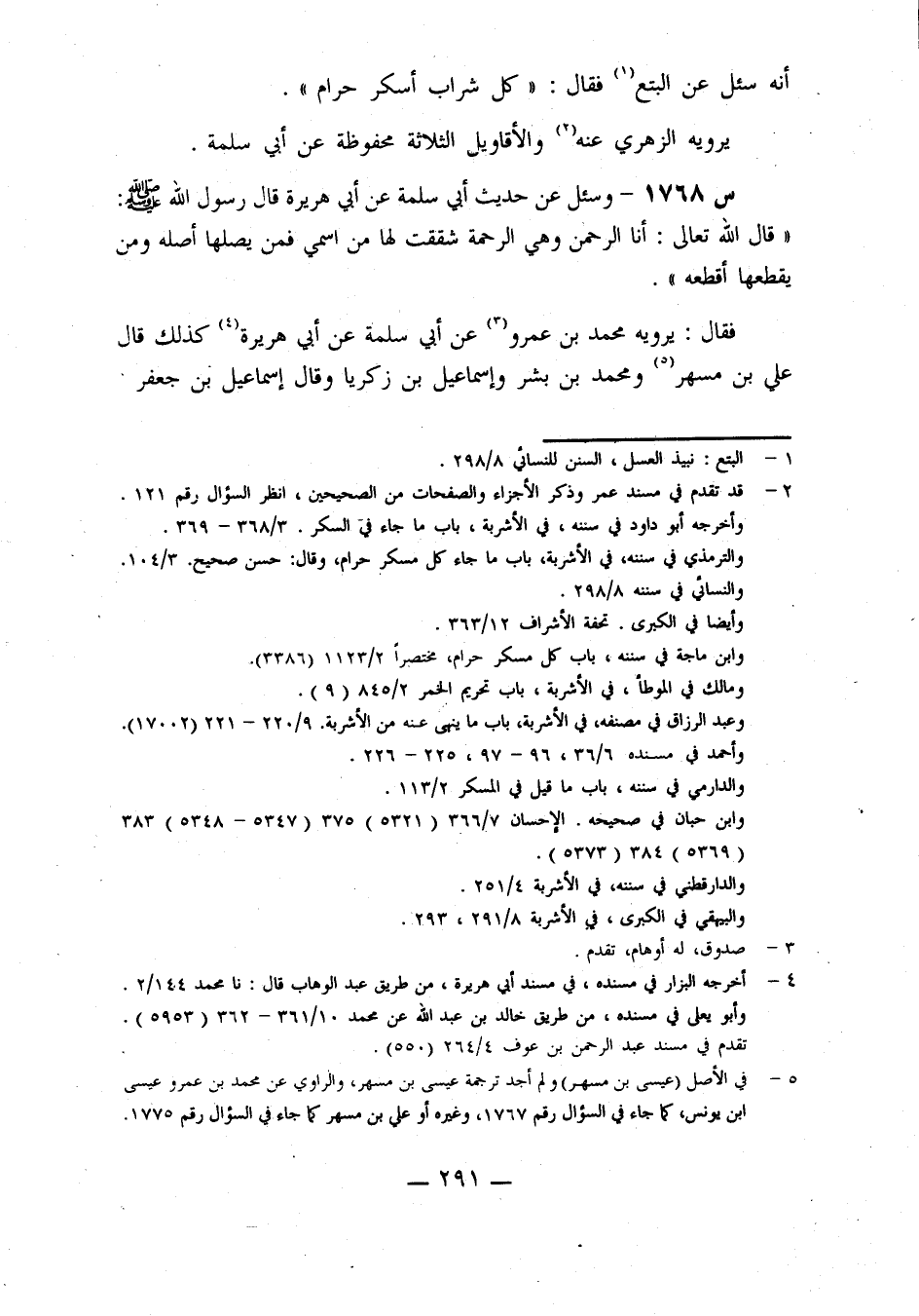 1768- وَسُئِلَ عَنْ حَدِيثِ أَبِي سَلَمَةَ، عَنْ أَبِي هريرة، قال رسول الله صلى الله عليه وَسَلَّمَ: قَالَ اللَّهُ تَعَالَى: أَنَا الرَّحْمَنُ وَهِيَ الرَّحْمَةُ شَقَقْتُ لَهَا مِنَ اسْمِي فَمَنْ يَصِلْهَا أَصِلْهُ وَمَنْ يَقْطَعْهَا أَقْطَعْهُ.