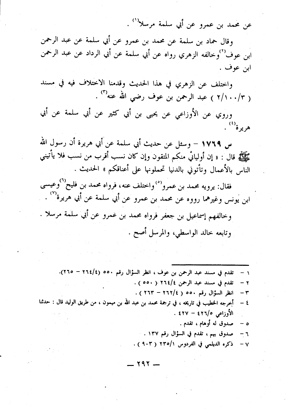 1769- وَسُئِلَ عَنْ حَدِيثِ أَبِي سَلَمَةَ، عَنْ أَبِي هريرة، أن رسول الله صلى الله عليه وَسَلَّمَ، قَالَ: إِنَّ أَوْلِيَائِي مِنْكُمُ الْمُتَّقُونَ وَإِنْ كَانَ نَسَبُ أَقْرَبَ مِنْ نَسَبٍ فَلَا يَأْتِينِي النَّاسُ بِالْأَعْمَالِ وَتَأْتُونِي بِالدُّنْيَا تَحْمِلُونَهَا عَلَى أَعْنَاقِكُمْ ... الْحَدِيثَ.