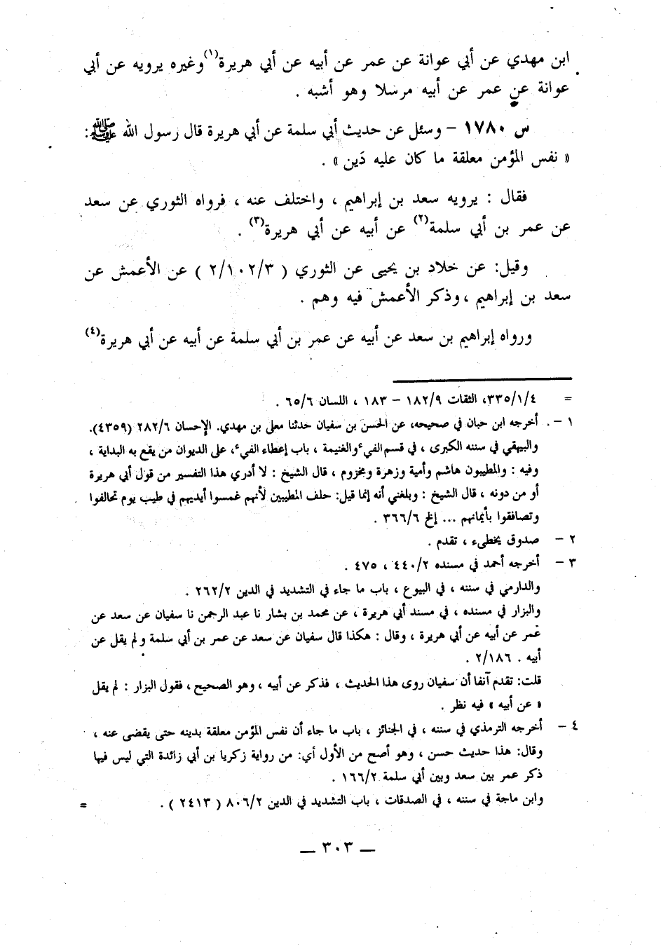 1780- وَسُئِلَ عَنْ حَدِيثِ أَبِي سَلَمَةَ، عَنْ أَبِي هريرة، قال رسول الله صلى الله عليه وَسَلَّمَ: نَفْسُ الْمُؤْمِنِ مُعَلَّقَةٌ مَا كَانَ عَلَيْهِ دَيْنٌ.