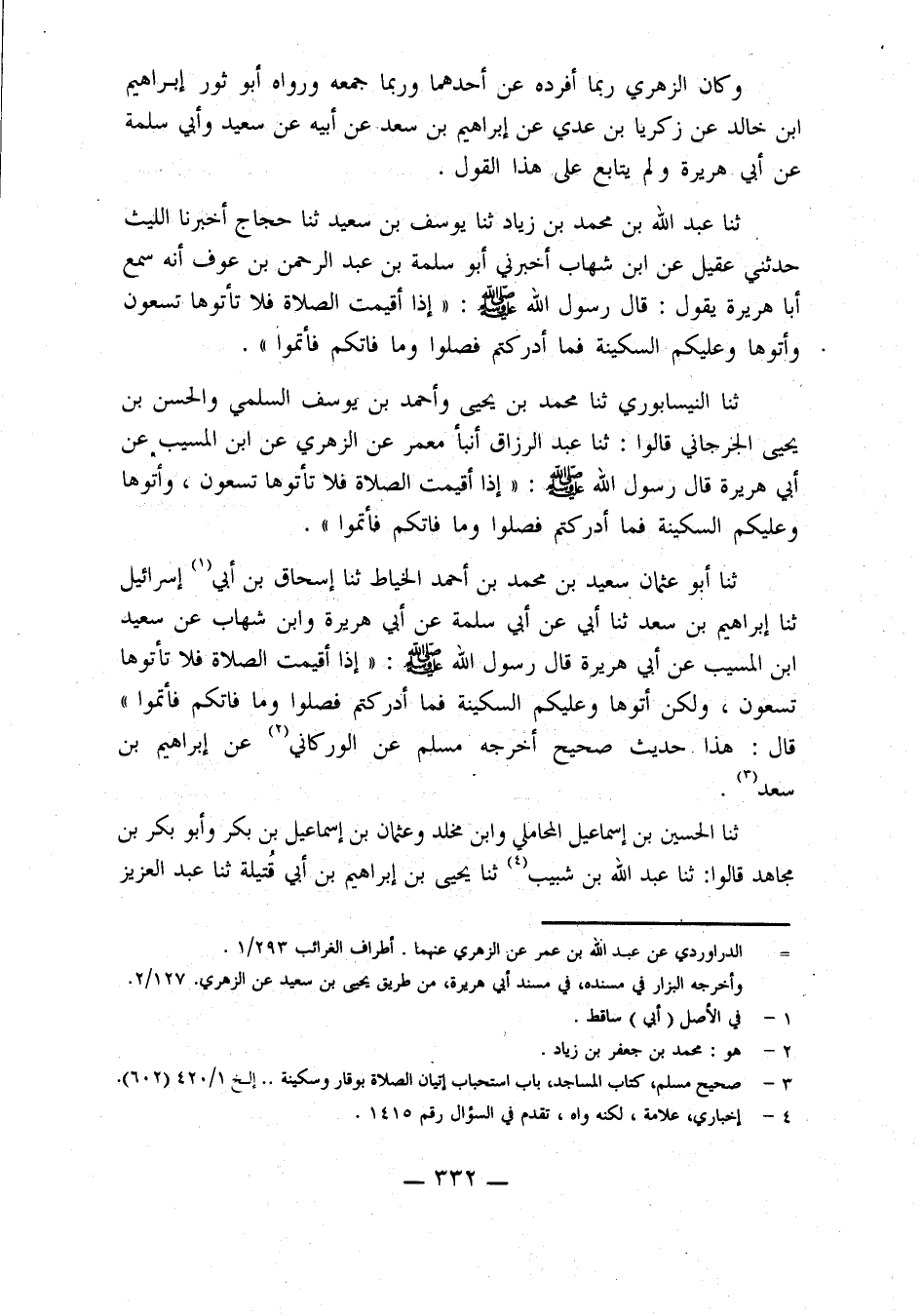 حدثنا أَبُو عُثْمَانَ سَعِيدُ بْنُ مُحَمَّدِ بْنِ أَحْمَدَ الخياط حدثنا إسحاق بن أبي إسرائيل حدثنا إبراهيم بن سعد حدثنا أَبِي، عَنْ أَبِي سَلَمَةَ، عَنْ أَبِي هُرَيْرَةَ، وَابْنِ شِهَابٍ عَنْ سَعِيدِ بْنِ الْمُسَيِّبِ، عَنْ أَبِي هريرة قال رسول الله صلى الله عَلَيْهِ وَسَلَّمَ إِذَا أُقِيمَتِ الصَّلَاةُ فَلَا تَأْتُوهَا تسعون ولكن أتوها وَعَلَيْكُمُ السَّكِينَةُ فَمَا أَدْرَكْتُمْ فَصَلُّوا وَمَا فَاتَكُمْ فَأَتِمُّوا قَالَ هَذَا حَدِيثٌ صَحِيحٌ أَخْرَجَهُ مُسْلِمٌ عن الوركاني عن إبراهيم بن سعد.