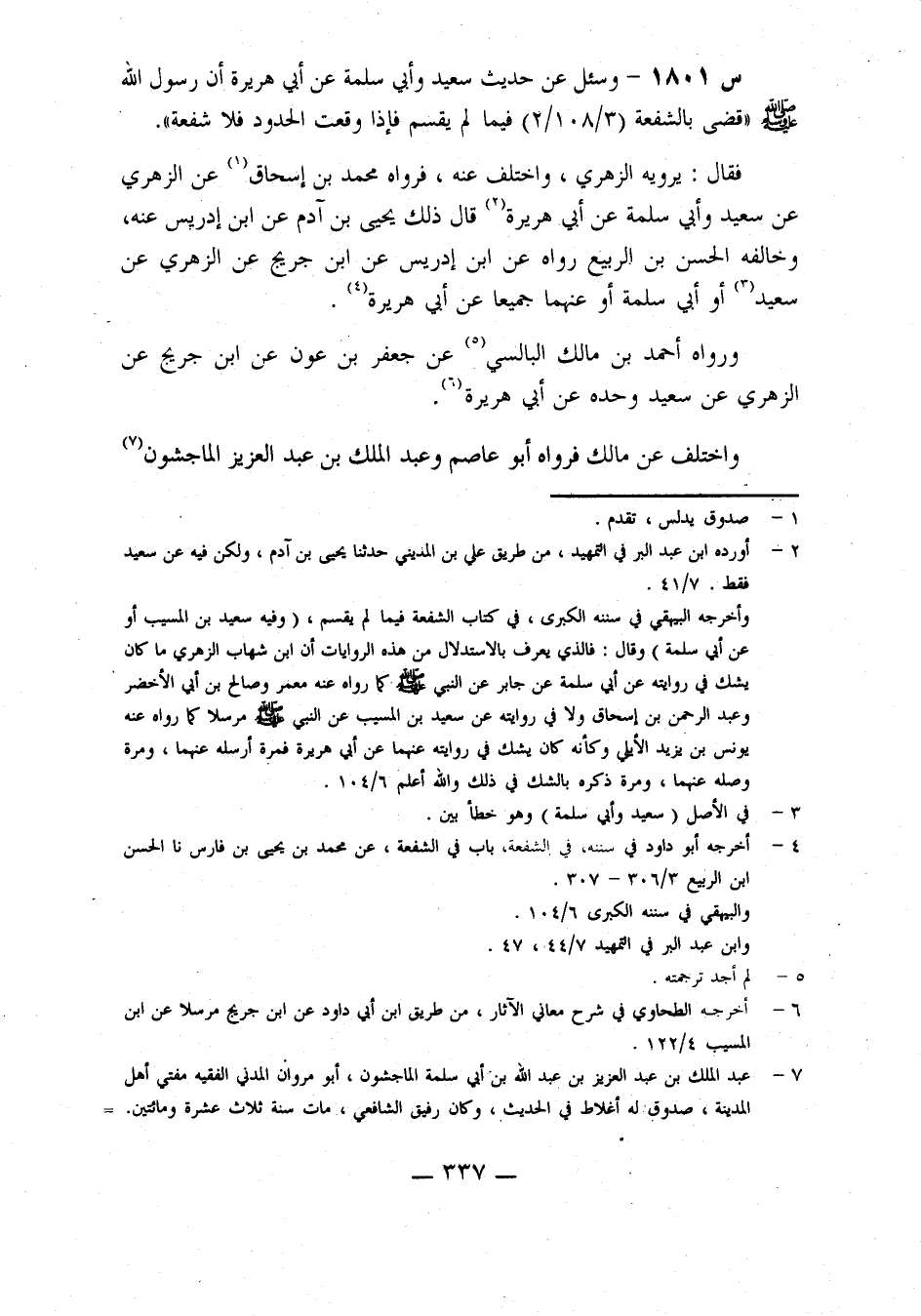 1801- وَسُئِلَ عَنْ حَدِيثِ سَعِيدٍ، وَأَبِي سَلَمَةَ، عَنْ أبي هريرة: أن رسول الله صلى الله عَلَيْهِ وَسَلَّمَ قَضَى بِالشُّفْعَةِ فِيمَا لَمْ يُقْسَمْ، فَإِذَا وَقَعَتِ الْحُدُودُ فَلَا شُفْعَةَ.