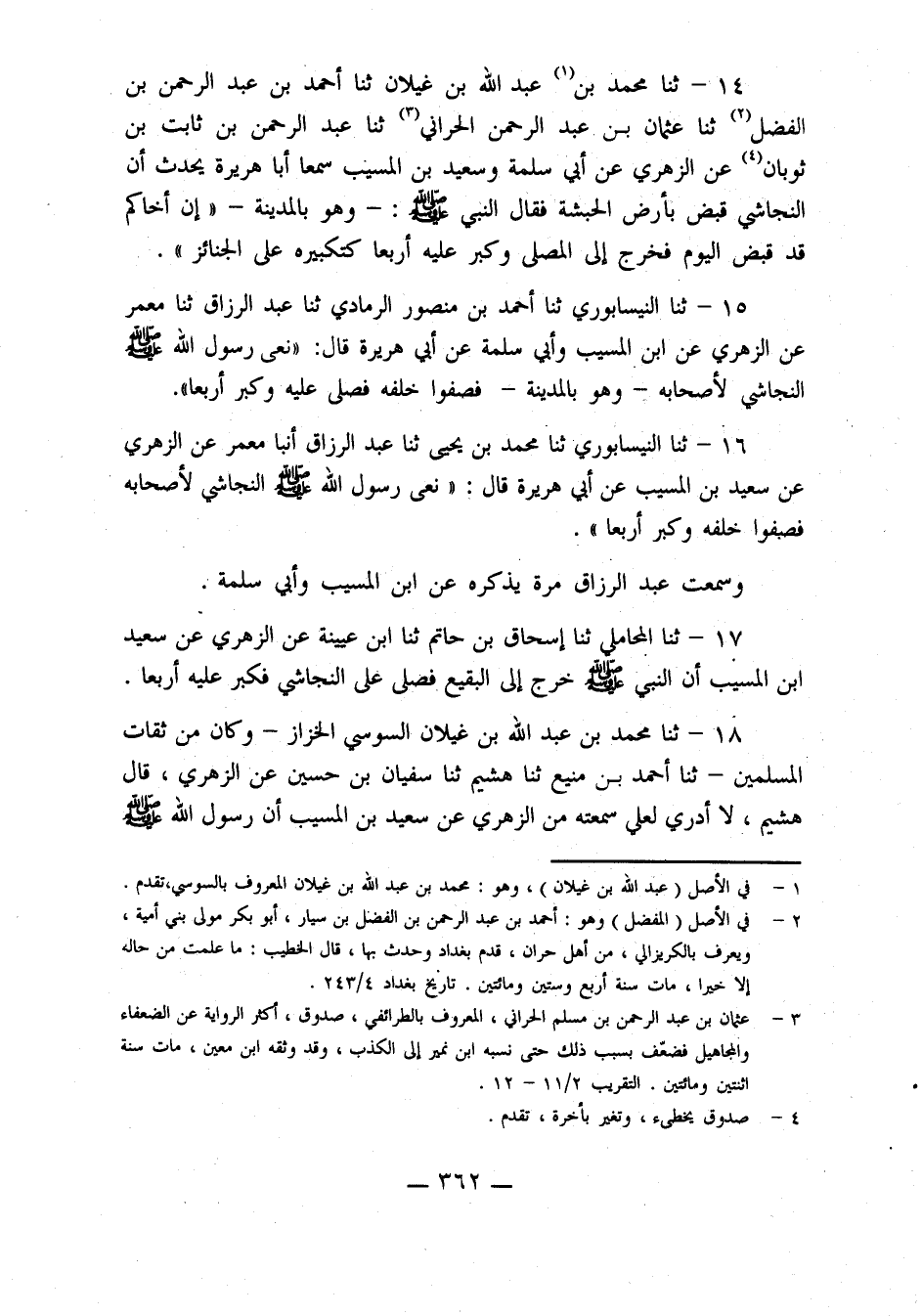 14- حدثنا محمد بن عبد الله بن غيلان، حدثنا أحمد بن عبد الرحمن بن الفضل، حدثنا عثمان بن عبد الرحمن الحراني، حدثنا عبد الرحمن بن ثابت بن ثوبان، عن الزُّهْرِيِّ، عَنْ أَبِي سَلَمَةَ، وَسَعِيدِ بْنِ الْمُسَيِّبِ، سَمِعَا أَبَا هُرَيْرَةَ يُحَدِّثُ أَنَّ النَّجَاشِيَّ قُبِضَ بِأَرْضِ الْحَبَشَةِ، فَقَالَ النَّبِيُّ صَلَّى اللَّهُ عَلَيْهِ وَسَلَّمَ وَهُوَ بِالْمَدِينَةِ: أَنَّ أَخَاكُمْ قَدْ قُبِضَ الْيَوْمَ فَخَرَجَ إِلَى الْمُصَلَّى وَكَبَّرَ عَلَيْهِ أَرْبَعًا كتكبيره على الجنائز.