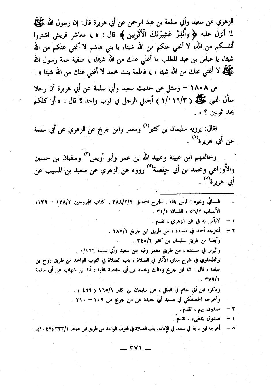 1808- وَسُئِلَ عَنْ حَدِيثِ سَعِيدٍ، وَأَبِي سَلَمَةَ، عَنْ أَبِي هُرَيْرَةَ، أَنَّ رَجُلًا سَأَلَ النَّبِيَّ صَلَّى اللَّهُ عَلَيْهِ وَسَلَّمَ: أَيُصَلِّي الرَّجُلُ فِي ثَوْبٍ وَاحِدٍ؟ قَالَ: أَوَ كُلُّكُمْ يَجِدُ ثَوْبَيْنِ؟.