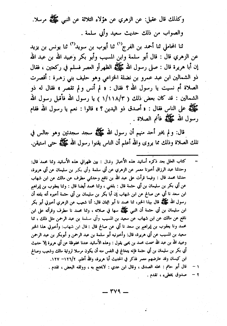 حدثنا المحاملي، حدثنا أحمد بن الفرج، حدثنا أيوب بن سويد، حدثنا يُونُسُ بْنُ يَزِيدَ، عَنِ الزُّهْرِيِّ، قَالَ: قَالَ أَبُو سَلَمَةَ، وَابْنُ الْمُسَيِّبِ، وَأَبُو بَكْرٍ، وَعُبَيْدُ اللَّهِ بْنُ عَبْدِ اللَّهِ، إِنَّ أَبَا هُرَيْرَةَ، قَالَ: صَلَّى رَسُولُ اللَّهِ صَلَّى اللَّهُ عَلَيْهِ وَسَلَّمَ الظُّهْرَ، أَوِ الْعَصْرَ فَسَلَّمَ فِي رَكْعَتَيْنِ، فَقَالَ ذُو الشِّمَالَيْنِ ابْنُ عَبْدِ عَمْرِو بْنُ نَضْلَةَ الْخُزَاعِيُّ وَهُوَ حَلِيفُ بَنِي زُهْرَةَ: أَقُصِرَتِ الصَّلَاةُ أَمْ نَسِيتَ يَا رَسُولَ اللَّهِ؟ فَقَالَ: لَمْ أَنْسَ وَلَمْ تُقْصَرْ، فَقَالَ لَهُ ذُو الشِّمَالَيْنِ: قَدْ كَانَ بَعْضُ ذَلِكَ يَا رَسُولَ اللَّهِ، فَأَقْبَلَ رَسُولُ اللَّهِ صَلَّى اللَّهُ عَلَيْهِ وَسَلَّمَ عَلَى النَّاسِ، فَقَالَ: أَصَدَقَ ذُو الْيَدَيْنِ؟ قَالُوا: نَعَمْ يَا رَسُولَ اللَّهِ، فَقَامَ رَسُولُ اللَّهِ صَلَّى اللَّهُ عَلَيْهِ وَسَلَّمَ فَأَتَمَّ الصَّلَاةَ.