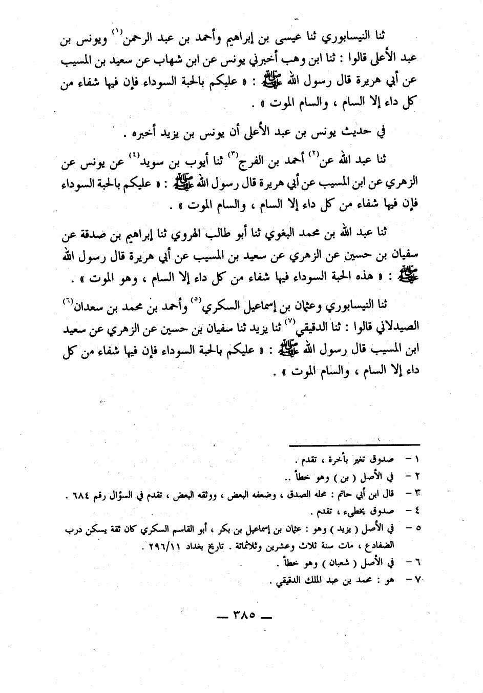 حدثنا النيسابوري، حدثنا عِيسَى بْنُ إِبْرَاهِيمَ، وَأَحْمَدُ بْنُ عَبْدِ الرَّحْمَنِ، وَيُونُسُ بْنُ عَبْدِ الْأَعْلَى، قالوا: حدثنا ابْنُ وَهْبٍ، أَخْبَرَنِي يُونُسُ، عَنِ ابْنِ شِهَابٍ، عن سعيد بن المسيب، عن أبي هريرة، قال رسول الله صلى الله عليه وسلم: عليكم بالحبة السوداء فإن فيها شفاء من كُلِّ دَاءٍ إِلَّا السَّامَ، وَالسَّامُ الْمَوْتُ.