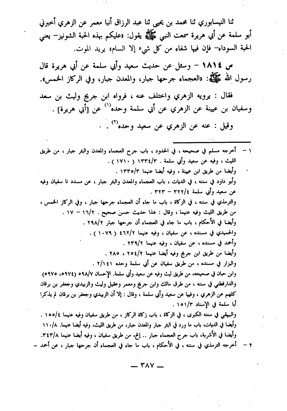 1814- وَسُئِلَ عَنْ حَدِيثِ سَعِيدٍ، وَأَبِي سَلَمَةَ، عَنْ أبي هريرة، قال رسول الله صلى الله عَلَيْهِ وَسَلَّمَ: الْعَجْمَاءُ جَرْحُهَا جُبَارٌ، وَالْمَعْدِنُ جُبَارٌ، وَفِي الرِّكَازِ الْخُمْسُ.