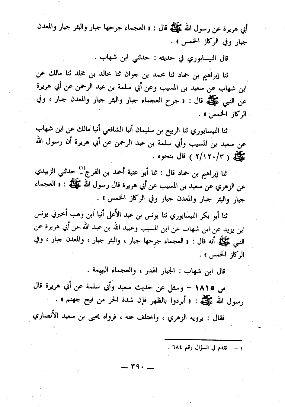 حدثنا إبراهيم بن حماد، قال: حدثنا أَبُو عُتْبَةَ أَحْمَدُ بْنُ الْفَرَجِ، حَدَّثَنِي الزُّبَيْدِيُّ، عَنِ الزُّهْرِيِّ، عَنْ سَعِيدِ بْنِ الْمُسَيِّبِ، عن أبي هريرة، قال رسول الله صلى الله عَلَيْهِ وَسَلَّمَ: الْعَجْمَاءُ جُبَارٌ، وَالْبِئْرُ جُبَارٌ، وَالْمَعْدِنُ جبار، وفي الركاز الخمس.