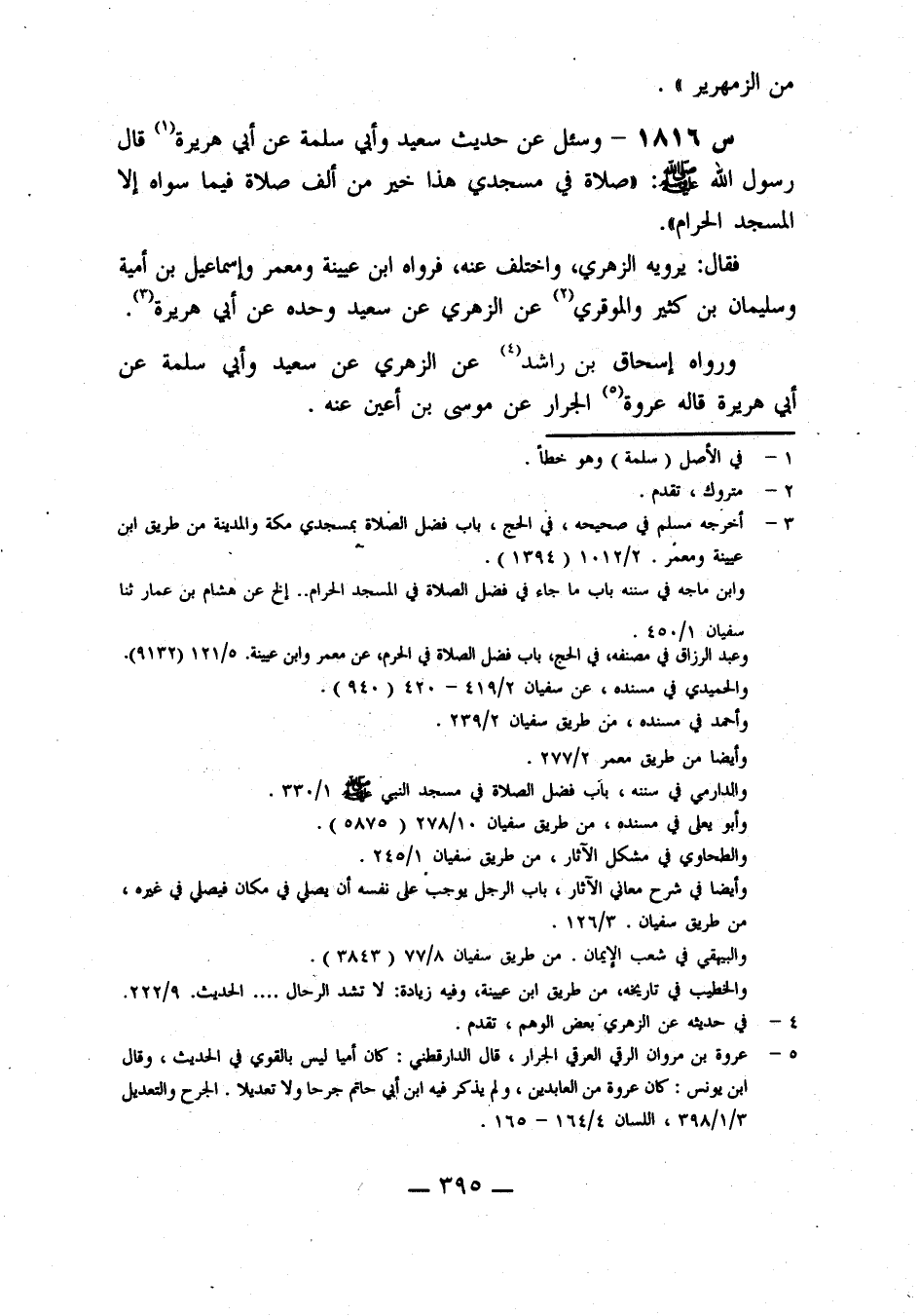 1816- وَسُئِلَ عَنْ حَدِيثِ سَعِيدٍ، وَأَبِي سَلَمَةَ، عَنْ أبي هريرة، قال رسول الله صلى الله عَلَيْهِ وَسَلَّمَ: صَلَاةٌ فِي مَسْجِدِي هَذَا خَيْرٌ مِنْ أَلْفِ صَلَاةٍ فِيمَا سِوَاهُ إِلَّا الْمَسْجِدَ الْحَرَامِ.