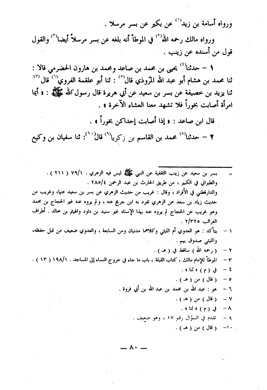 1- حَدَّثَنَا يَحْيَى بْنُ مُحَمَّدِ بْنِ صَاعِدٍ، وَمُحَمَّدُ بْنُ هَارُونَ الْحَضْرَمِيُّ، قالا: حدثنا مُحَمَّدُ بْنُ هِشَامٍ أَبُو عَبْدِ اللَّهِ الْمُرُّوذِيُّ، قال: حدثنا أبو علقمة الفروي، قال: حدثنا يَزِيدُ بْنُ خُصَيْفَةَ، عَنْ بُسْرِ بْنِ سَعِيدٍ، عَنْ أَبِي هُرَيْرَةَ، قَالَ رَسُولُ اللَّهِ صلى اللَّهُ عَلَيْهِ وَسَلَّمَ: أَيُّمَا امْرَأَةٍ أَصَابَتْ بَخُورًا فَلَا تَشَهَدْ مَعَنَا الْعِشَاءَ الْآخِرَةَ.