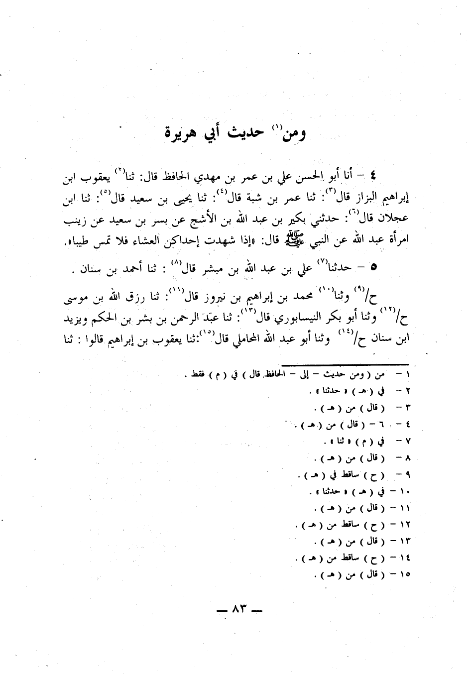 4 ـ أخبرنا أَبُو الْحَسَنِ عَلِيُّ بْنُ عُمَرَ بْنِ مَهْدِيٍّ الحافظ، قال: حدثنا يعقوب بن إبراهيم البزاز، قال: حدثنا عمر بن شبة، قال: حدثنا يحيى بن سعيد، قال: حدثنا ابْنُ عَجْلَانَ، قَالَ: حَدَّثَنِي بُكَيْرُ بْنُ عَبْدِ اللَّهِ بْنِ الْأَشَجِّ، عَنْ بُسْرِ بْنِ سَعِيدٍ، عَنْ زَيْنَبَ امْرَأَةِ عَبْدِ اللَّهِ، عَنِ النَّبِيِّ صَلَّى اللَّهُ عَلَيْهِ وَسَلَّمَ، قَالَ: إِذَا شَهِدَتْ إِحْدَاكُنَّ الْعِشَاءَ فَلَا تَمَسَّ طِيبًا.