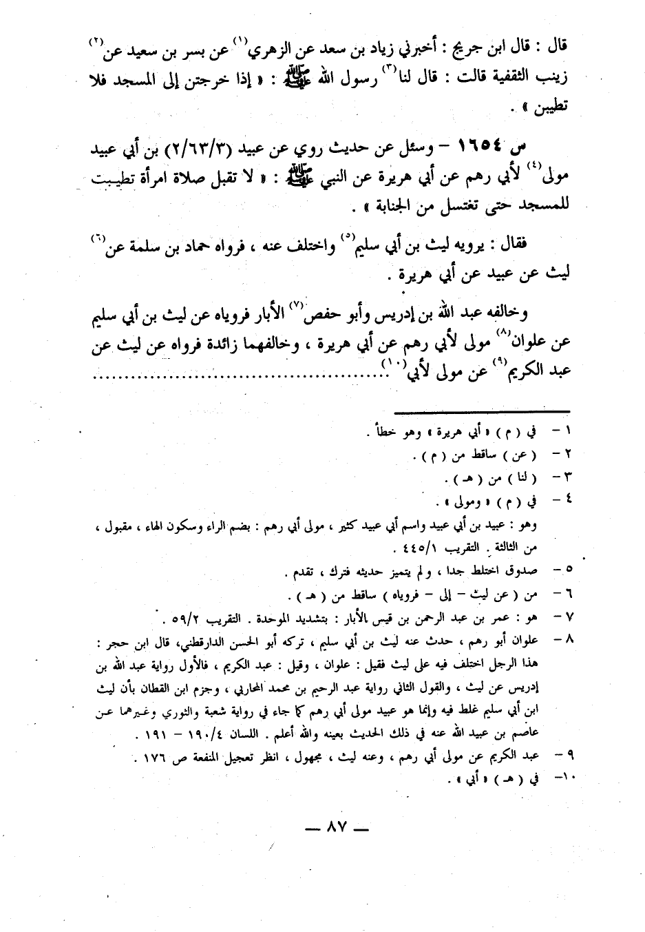 1654- وَسُئِلَ عَنْ حَدِيثِ رُوِيَ عَنْ عُبَيْدِ بْنِ أَبِي عُبَيْدٍ مَوْلًى لِأَبِي رُهْمٍ، عَنْ أَبِي هريرة، عن النبي صلى الله عليه وسلم: لَا تُقْبَلْ صَلَاةُ امْرَأَةٍ تَطَيَّبَتْ لِلْمَسْجِدِ حَتَّى تَغْتَسِلَ مِنَ الْجَنَابَةِ.