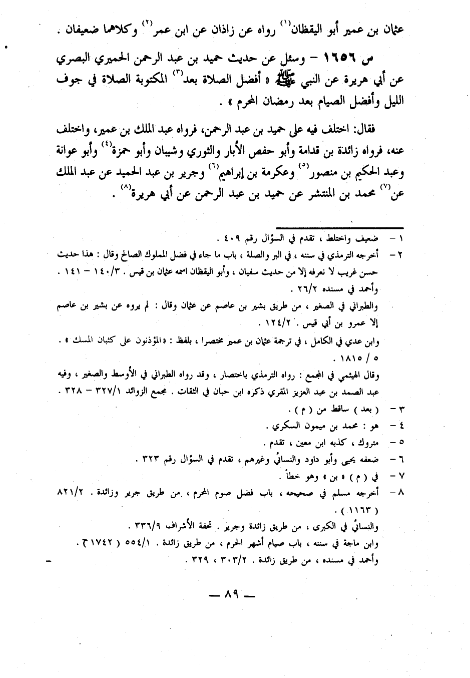 1656- وَسُئِلَ عَنْ حَدِيثِ حُمَيْدِ بْنِ عَبْدِ الرَّحْمَنِ الْحِمْيَرِيِّ الْبَصْرِيِّ، عَنْ أَبِي هُرَيْرَةَ، عَنِ النَّبِيِّ صَلَّى اللَّهُ عَلَيْهِ وَسَلَّمَ: أَفْضَلُ الصَّلَاةِ بَعْدَ الْمَكْتُوبَةِ الصَّلَاةُ فِي جَوْفِ اللَّيْلِ، وَأَفْضَلُ الصِّيَامِ بَعْدَ رَمَضَانَ الْمُحَرَّمُ.