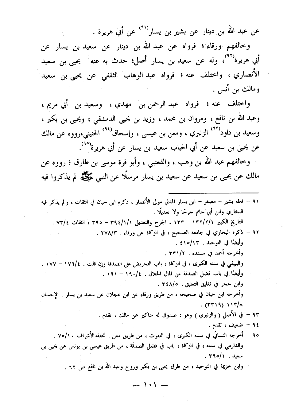 وَخَالَفَهُمْ وَرْقَاءُ، فَرَوَاهُ عَنْ عَبْدِ اللَّهِ بْنِ دِينَارٍ، عَنْ سَعِيدِ بْنِ يَسَارٍ، عَنْ أَبِي هُرَيْرَةَ، وَلَهُ عَنْ سَعِيدِ بْنِ يَسَارٍ أَصْلٌ حَدَّثَ بِهِ عَنْهُ يَحْيَى بْنُ سَعِيدٍ الْأَنْصَارِيُّ، وَاخْتُلِفَ عَنْهُ؛