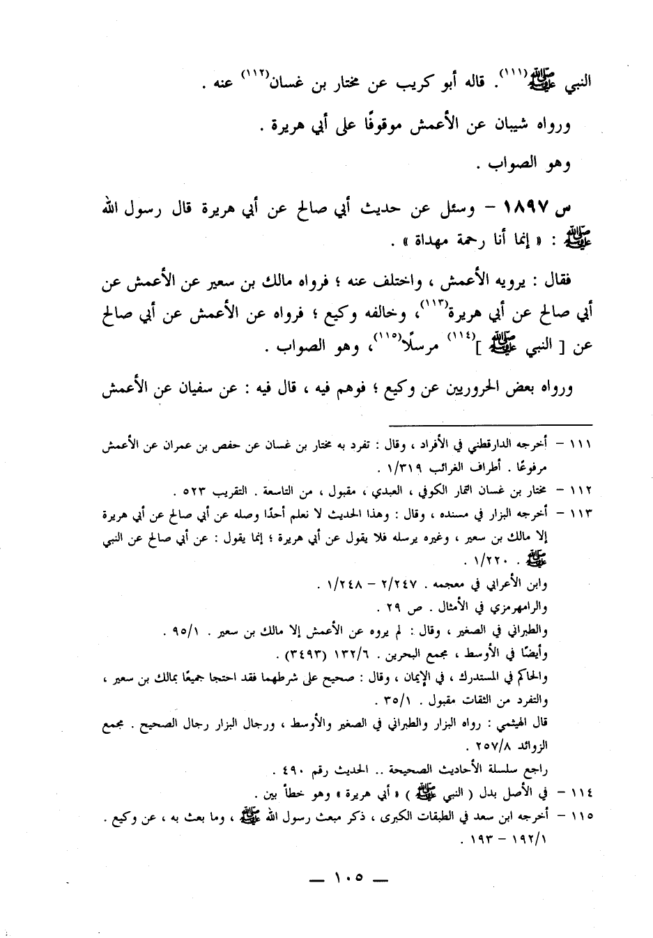 1897- وَسُئِلَ عَنْ حَدِيثِ أَبِي صَالِحٍ، عَنْ أَبِي هريرة، قال رسول الله صلى الله عليه وَسَلَّمَ: إِنَّمَا أَنَا رَحْمَةٌ مُهْدَاةٌ.