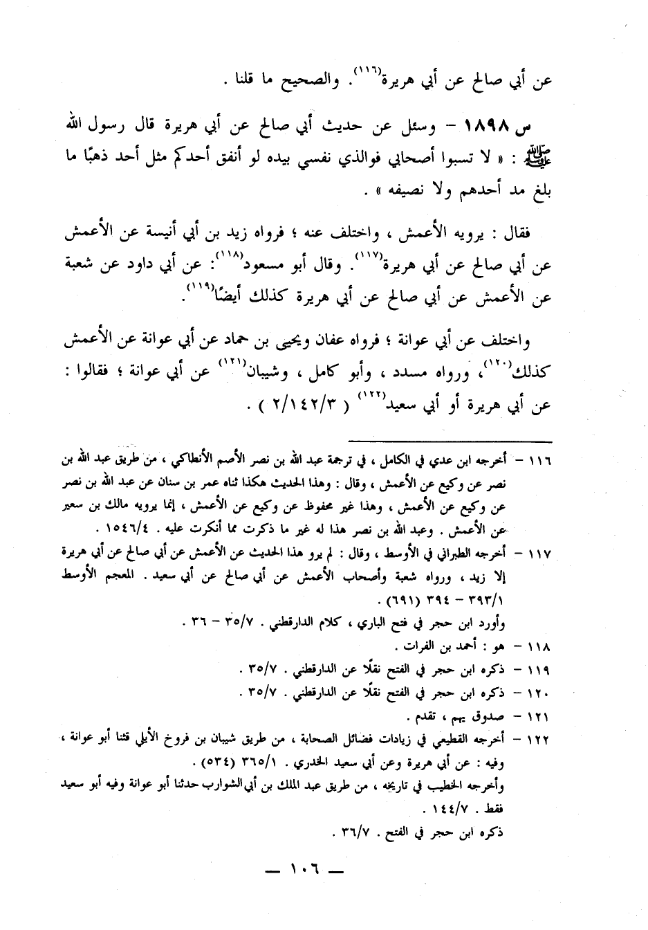 1898- وَسُئِلَ عَنْ حَدِيثِ أَبِي صَالِحٍ، عَنْ أَبِي هريرة، قال رسول الله صلى الله عليه وَسَلَّمَ: لَا تَسَبُّوا أَصْحَابِي فَوَالَّذِي نَفْسِي بِيَدِهِ لو أنفق أحدكم مثل أحد ذهبا ما بَلَغَ مُدَّ أَحَدِهِمْ وَلَا نَصِيفَهُ.