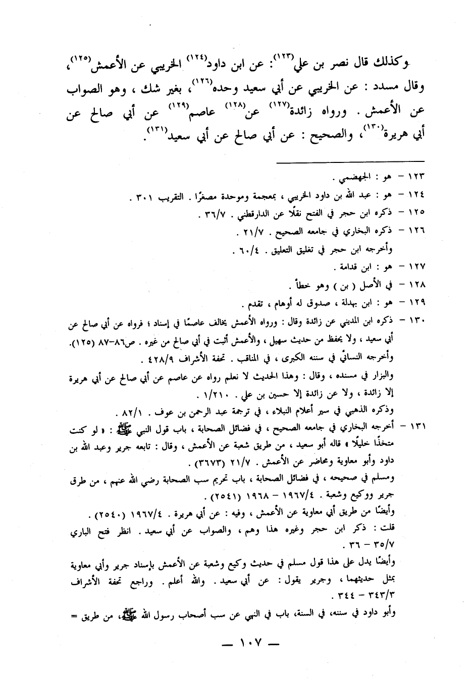 وَكَذَلِكَ قَالَ نَصْرُ بْنُ عَلِيٍّ: عَنِ ابْنِ دَاوُدَ الْخُرَيْبِيِّ، عَنِ الْأَعْمَشِ، وَقَالَ مُسَدَّدٌ: عَنِ الْخُرَيْبِيِّ، عَنْ أَبِي سَعِيدٍ وَحْدَهُ، بِغَيْرِ شَكٍّ، وَهُوَ الصَّوَابُ، عَنِ الْأَعْمَشِ.